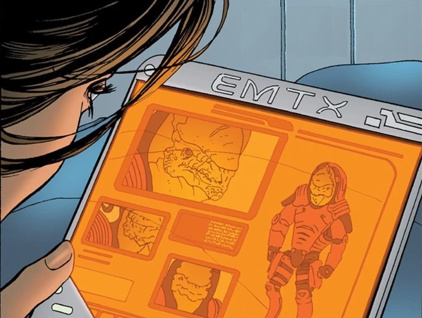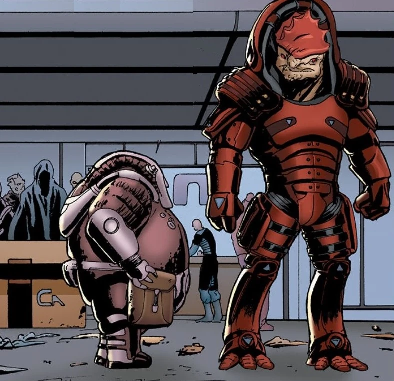 Wrex regt sich gerade darüber auf, dass dies ein einfacher Job sein sollte und immer etwas dazwischenkommt, als er plötzlich in die Brust getroffen wird. Er steht wieder auf und nähert sich einem gepanzerten Menschen. Nachdem er diesem in den Rücken geschossen hat, und ihn mit vorgehaltener Waffe stellt, nimmt der Mensch seinen Helm ab und identifiziert sich als Jasox, der gesteht, dass er nur geschickt wurde, um ihn zu bremsen, nicht um ihn zu töten. Offenbar kennen sich der Kroganer und Jasox.
