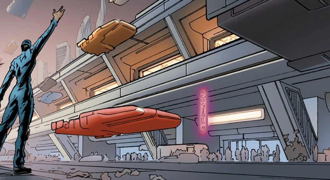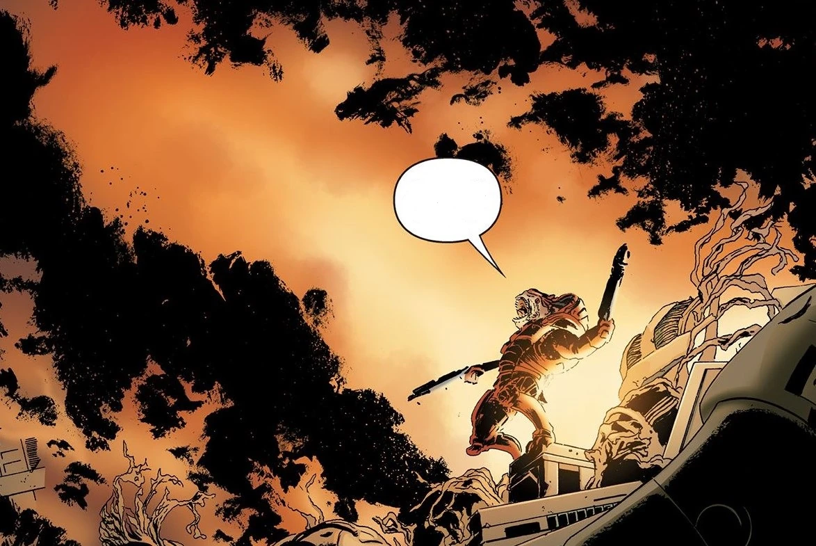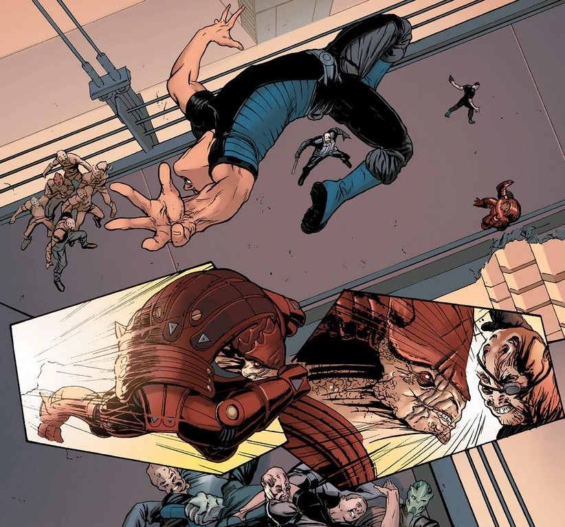 Plötzlich gibt es in den Lagerhäusern, gegenüber von Fists fensterreichen Behausung, eine große Explosion. Leng vermutet richtig, dass das wohl Rasas "Komplikation" - Wrex - gewesen sein muss, der sich gerade mit dem, der ihn aufhalten sollte, "vergnügt".