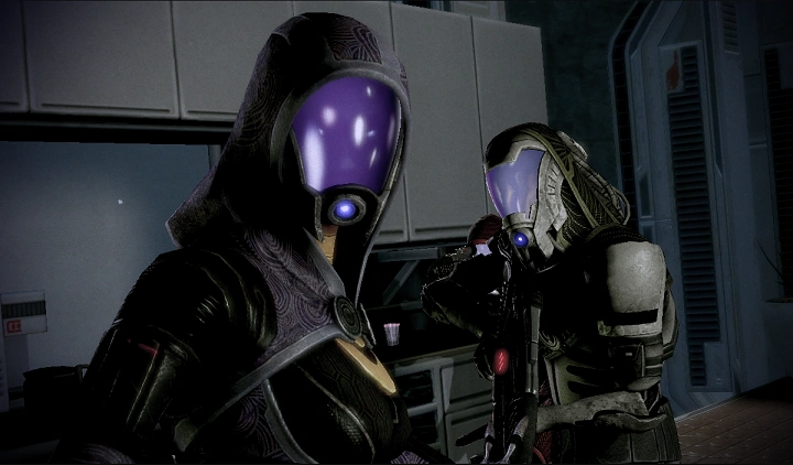 - Erst in Mass Effect 3 besteht die Möglichkeit, während der Romanze mit Tali von ihr ein Bild für die Kabine geschenkt zu bekommen. Auf diesem Bild ist Tali ohne Maske und Anzug zu sehen. Aus unbekannten Gründen wurde dieses Bild jedoch für die Legendary Edition abgeändert.