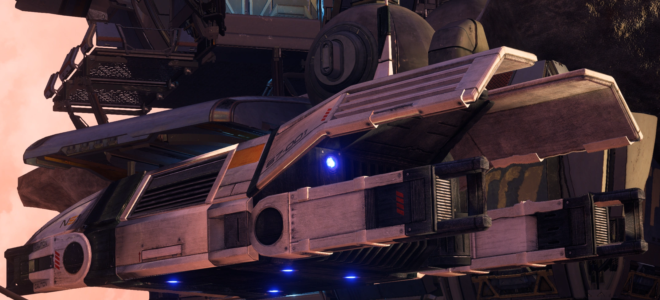 Die axial montierten Triebwerke wurden entfernt und das Shuttle muss die beweglichen Triebwerke zum Landen verwenden. Auf der Vorderseite des Shuttles befinden sich zwei Scheinwerferpaare.