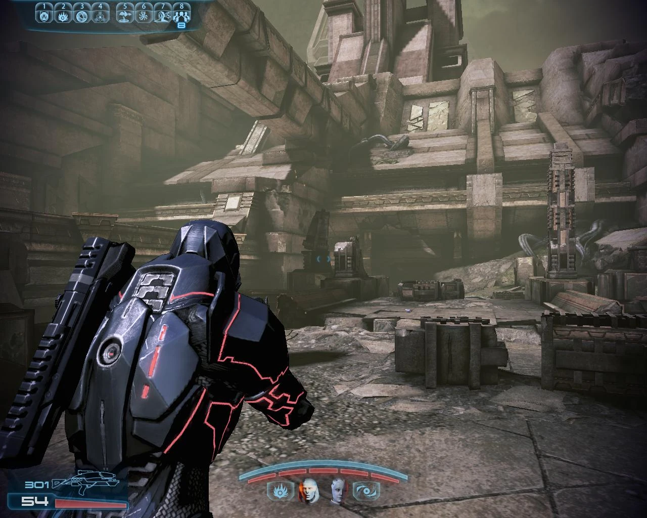 Après l'accident sur le convoi, reprenez la route à pied à travers les ruines. Avancez sans trop vous soucier des surprises, il n'y a aucun piège ou ennemis. Près de la sortie, vous tomberez sur un cadavre rachni de moissonneur, qui vous donne un avant goût de ce qui vous attend à la lumière du jour.