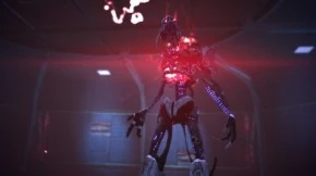 As the Fleet engages the ships outside—geth dropships and Sovereign itself—Shepard tells the squad to check Saren and make sure he's dead. They drop down to the bottom of the Chambers—one coldly shoots Saren in the head, while the other confirms the kill to Shepard. Suddenly Saren's body begins to twitch as his implants fire up, burning his flesh away until he is a cybernetic construct like a Husk, completely possessed by Sovereign. The shockwaves from his transformation cause the platform to collapse and Shepard falls into the bottom of the Chambers. The squad fights back against the creature, but it is fast and deadly.