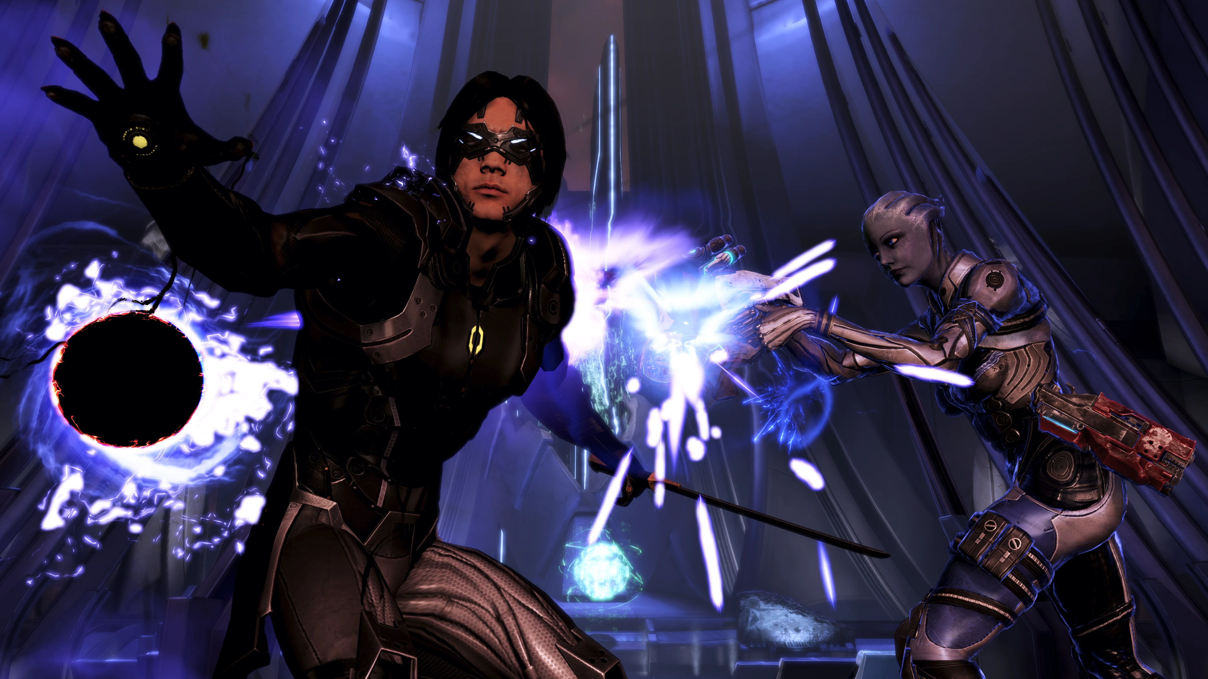 Poco prima della battaglia finale a Londra, Liara commenta di come le loro "piccole bambine blu" avrebbero voluto ascoltare un suo discorso, al che Shepard risponde che si inventeranno una bella storia per loro. In seguito, Liara offre un dono a Shepard: fondere la sua coscienza con quella di Shepard e condividere i suoi ricordi, una pratica che le asari riservano per i loro amici più cari e le persone che rispettano. All'interno dello spazio mentale, i due si baciano, con una forte luce da dietro che illumina il vuoto.