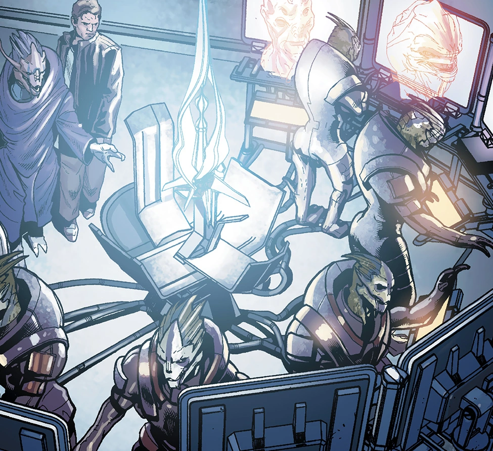 La prova che la quarian ha trovato erano un file audio che è riuscita a recuperare da un nucleo di memoria geth, il che è una chiara dimostrazione che c'era Saren dietro all'attacco su Eden Prime. Tuttavia, il file suggerisce che Saren sta cercando qualcosa chiamato il Condotto con l'aiuto di una potente asari chiamata Matriarca Benezia, per attuare il "ritorno dei Razziatori". Quando la prova viene presentata al Consiglio, Saren viene spogliato del suo stato di Spettro, ma sono reclutanti a mandare una flotta al suo inseguimento per arrestarlo. Non viene mostrato alcun interesse verso i Razziatori.