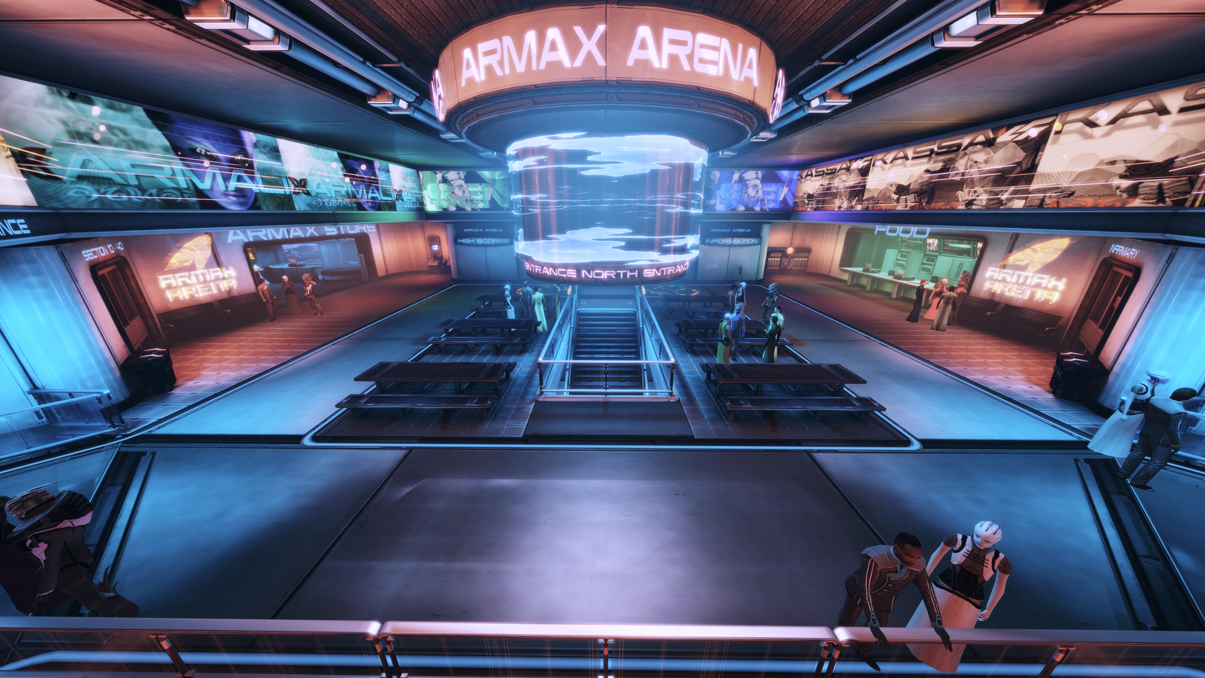Вход на Арену находится напротив входа в квартиру Шепард(а). Слева находится ВИ, с которым надо поговорить для получения доступа на Арену. Справа — магазин «Армакс Арсенал», где можно обменять жетоны, купить снаряжение, усовершенствовать оружие и получить подарочную броню. Прямо — вход на Арену. Сразу после лестницы находится панель настройки боя. Справа от неё — вход в раздевалку, где можно настроить броню и оружие для себя и сопартийцев. Там же находится лифт на Арену.