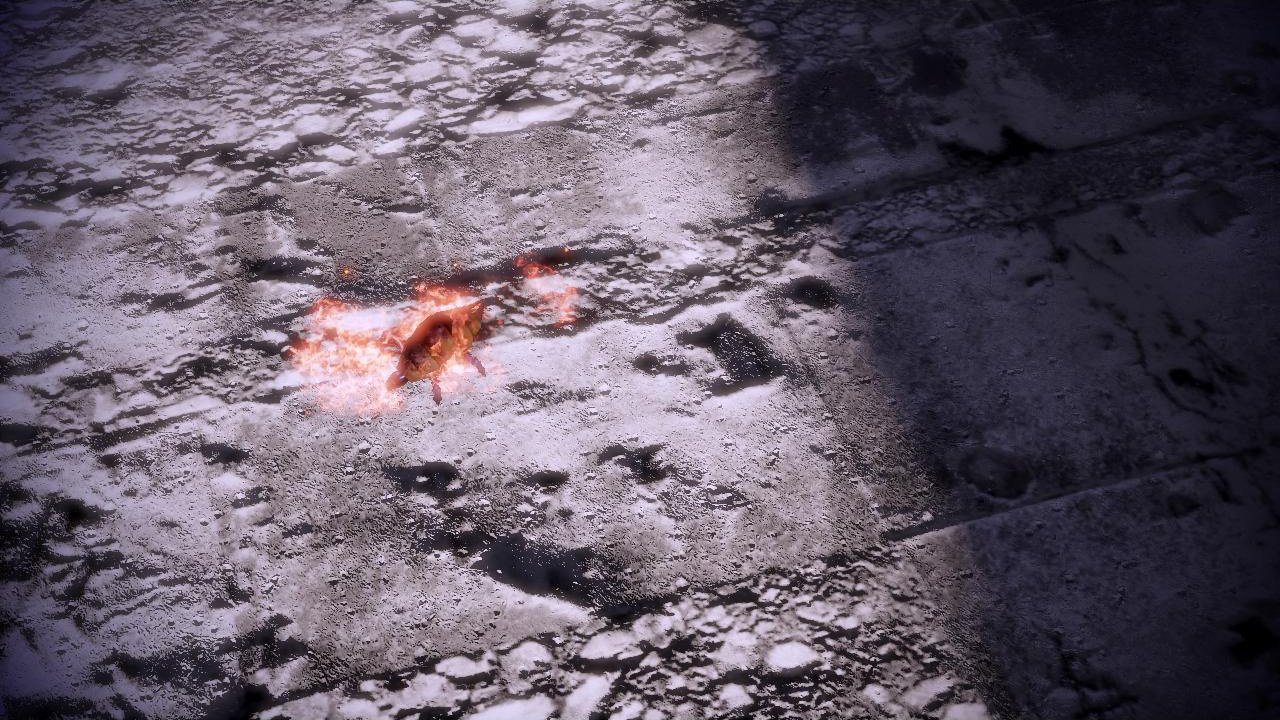 Завершив беглый осмотр, движемся дальше по дорожке, сквозь каменные джунгли. В конце перехода уничтожаем двух гетов, увлеченно стреляющих по мертвому кварианцу. Прослушиваем обращение по рации от Кэл’Ригар, созывающего всех оставшихся кварианцев к себе на помощь. Осматриваем поврежденного гета-охотника, получаем кредиты (не дайте себя обмануть: охотник периодически уходит в полный инвиз, во время которого его невозможно осмотреть, так что не спешите отворачиваться, подождите, пока его силует проявится), с тела мертвого кварианца подбираем пистолет-пулемет M-9 «Ярость». По рации выходим на связь с Кэл’Ригаром, сообщая ему о смерти его товарищей и обещая явиться на помощь. Он укрылся со своим немногочисленным отрядом в лагере в долине, но их отчаянно теснят геты. Тали удалось добраться до исследовательского комплекса и забаррикадироваться внутри. Геты начали атаку сразу после обнаружения непрошеных гостей, перебрасывая подкрепления с помощью десантных капсул. Закончив переговоры по рации, дорогу к группе преградит каменная колонна, упавшая перед дверью не выдержав очередной атаки десантной капсулы гетов.