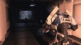 Примечание: Можно пройти этот участок быстро, заняв укрытие у дальней двери. Убив одного робота, который выйдет из двери, можно пробежать дальше, избежав тех, что выйдут из складской комнаты. ЛОКИ не будут вас преследовать, они не могут войти в коридор, а если были с помощью умений заброшены в коридор, то будут стремиться покинуть его.