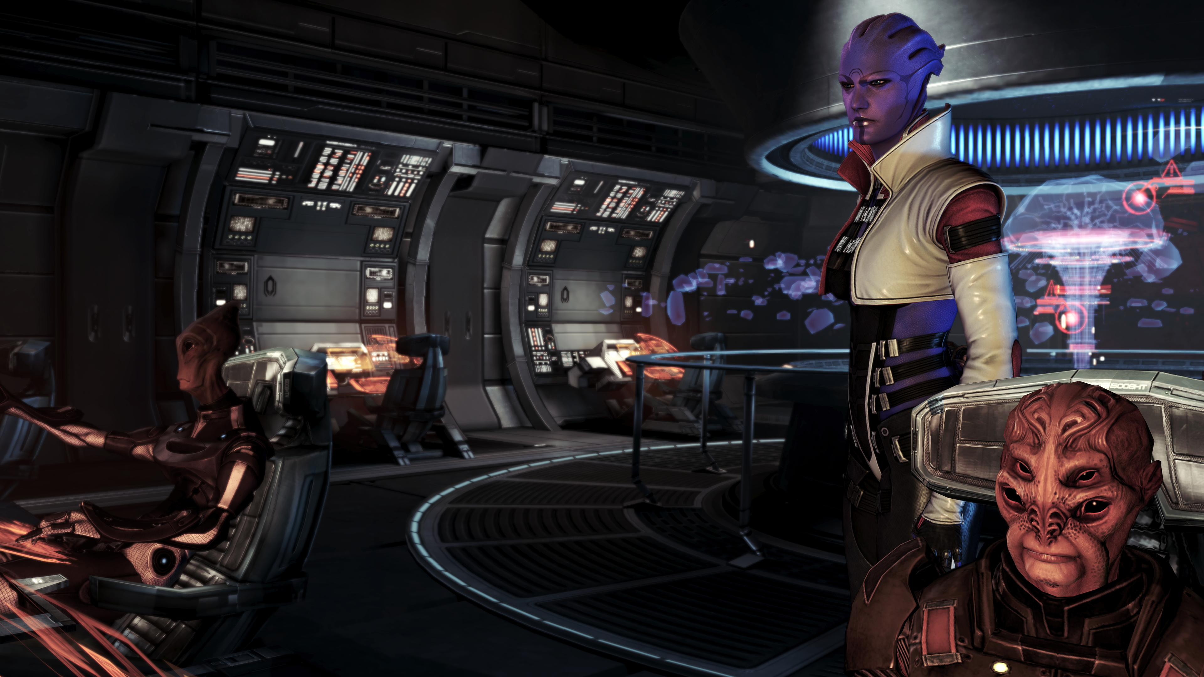 Ready to begin her campaign to retake Omega from Cerberus, Aria enlists Commander Shepard to spearhead the ground attack on the station. She meets Shepard not in the Purgatory Bar but in Docking Bay 42, needing discretion as she explains to the Commander. She has already amassed an assortment of ships to directly attack the Cerberus blockade and punch through to Omega's surface.