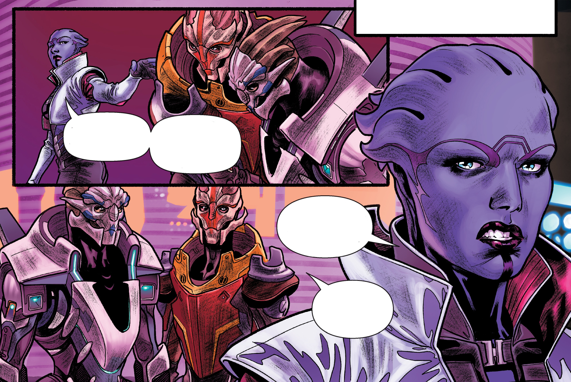 Aria then demands to know Tiran's business on Omega. He claims he's working for the Andromeda Initiative and looking for a quarian scientist of theirs. Aria thinks it's a con job, but ultimately is dismissive of the turian and warns him never to show his face again after doing what he came on Omega to do. She then berates Nyreen for wasting her time with "strays".