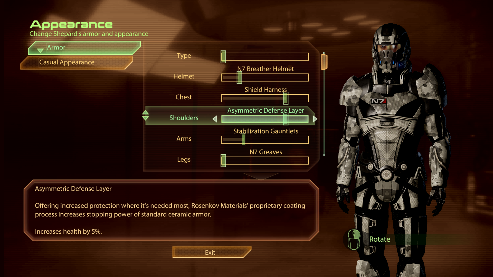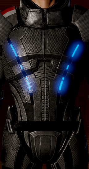 In Mass Effect 2, Commander Shepard's armor can be customized by swapping out pieces of the default N7 Armor for pieces purchased from merchants, or made available as downloadable content, by using the Armor Locker aboard the Normandy SR-2. Besides augmenting the armor's physical appearance, these pieces also have varying effects on Shepard's combat effectiveness. Additionally, the player can further customize the armor's appearance by changing its color, reflectiveness or applying a pattern.