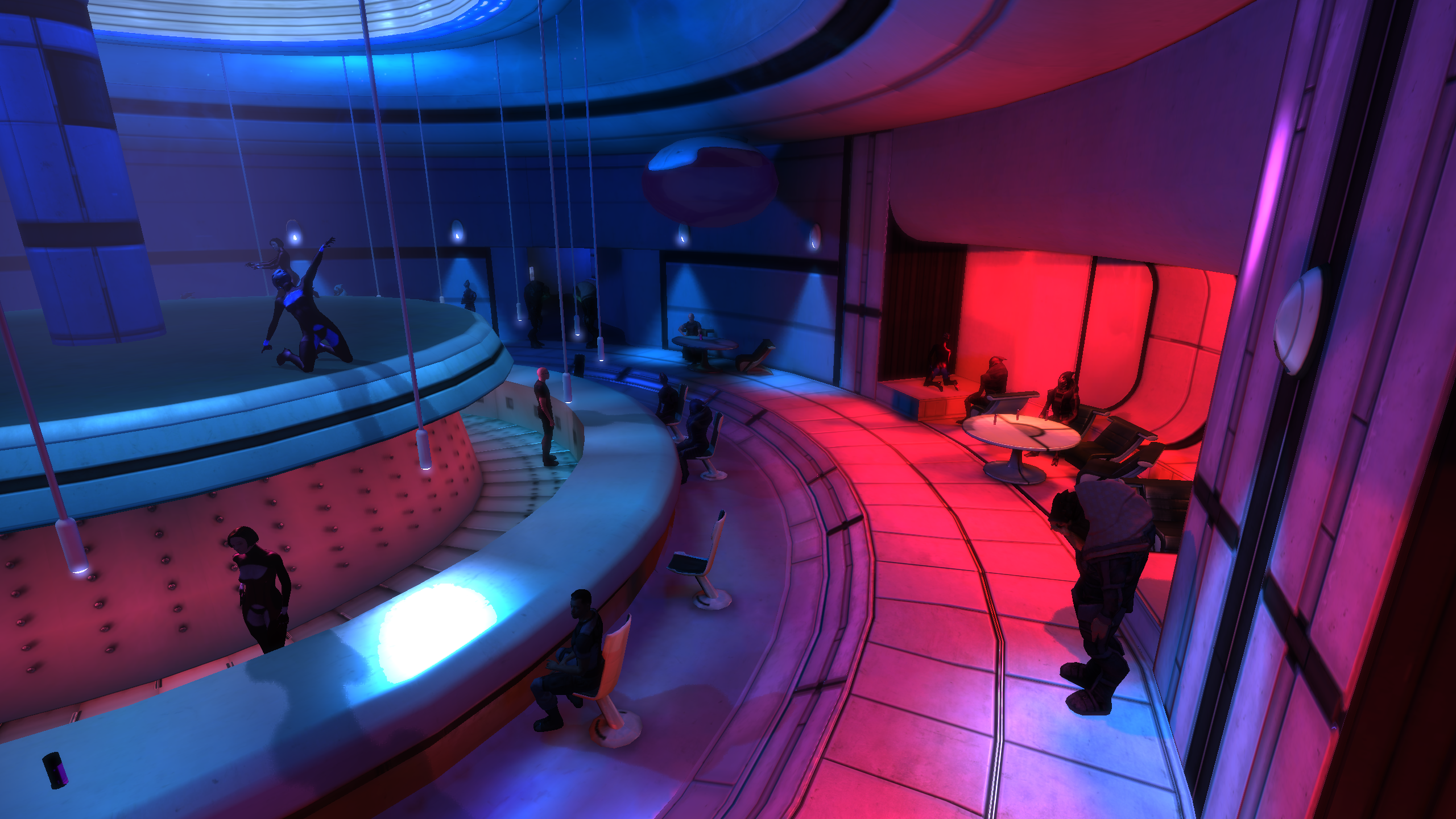 The club usually has many patrons, and lively music. The highlight of the club is the asari dancers, who offer private shows—Commander Shepard has the opportunity to watch a show in an empty seat. Compared to Flux, Chora's Den is described as "livelier but deadlier".