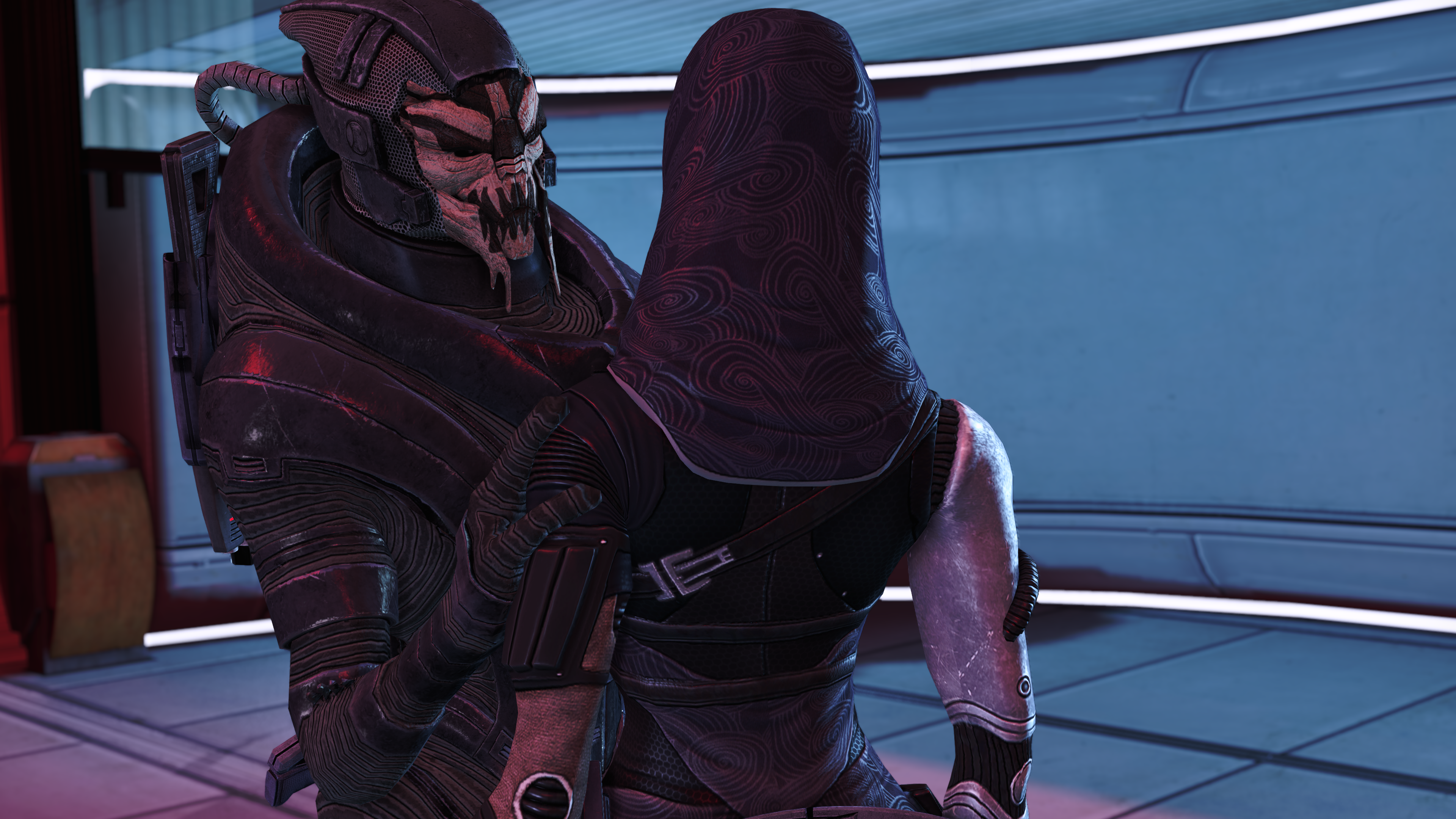 The quarian is talking to a turian and asking for the Shadow Broker. The turian tells her that the Shadow Broker is coming, but she tells him the deal's off. The other assassins nearby pull their pistols and the quarian throws a grenade and sends them reeling.