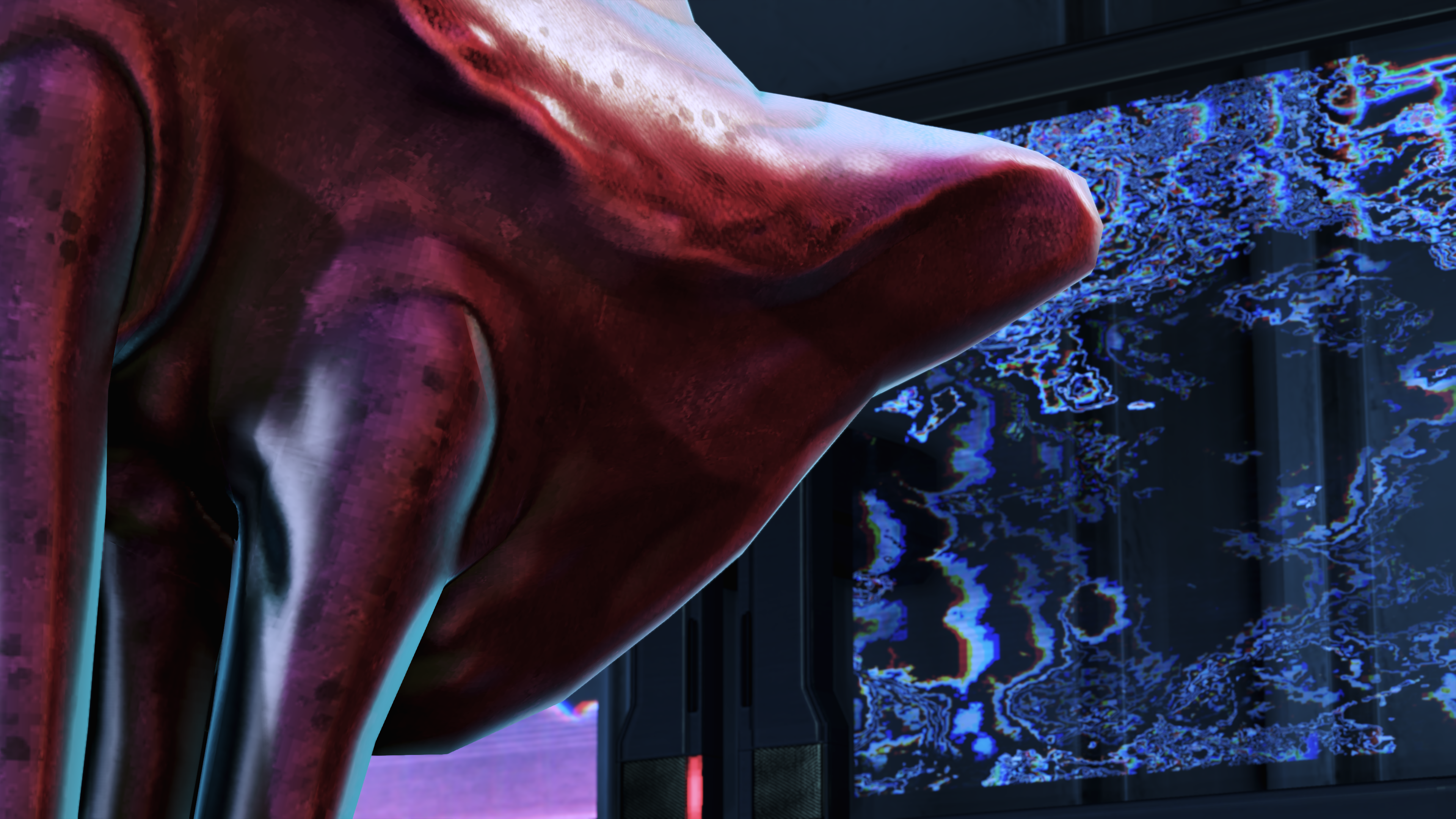 Zymandis says that the defenses for the hanar homeworld are largely automated, and can be shut down by a single virus, which he has just uploaded. Bau quickly springs into action and attempts to block the transmission, but a human bodyguard standing at the door quickly puts his hands around Bau's throat. Bau attempts to throw him off.