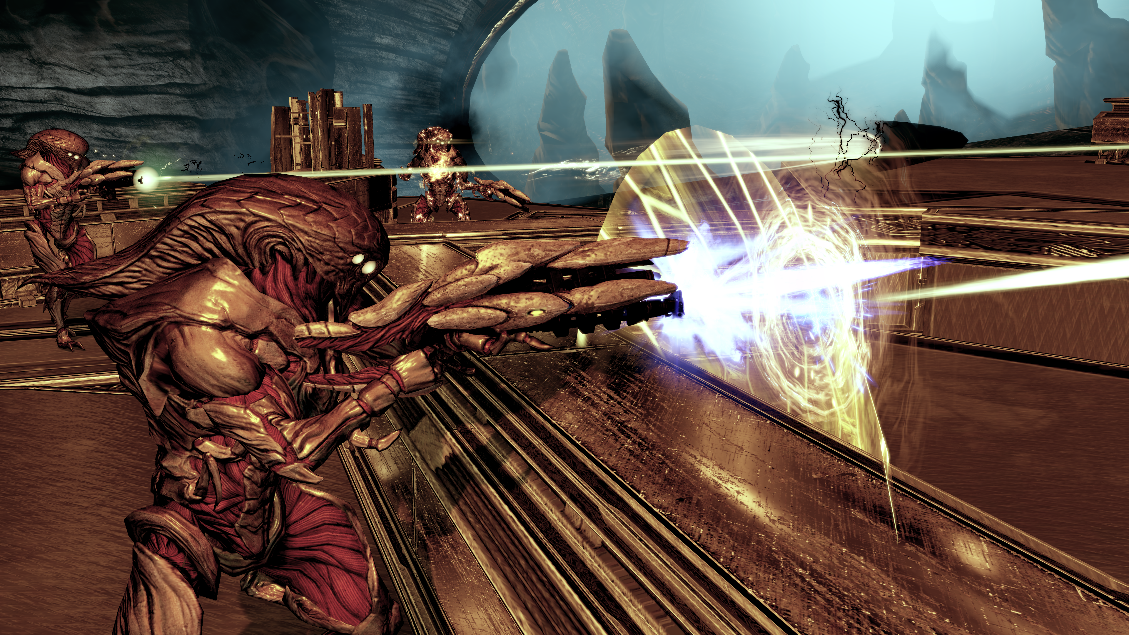 - During the final boss fight, it was at one point possible to take control of enemy turrets. Harbinger would also use different comments at Shepard.[4]