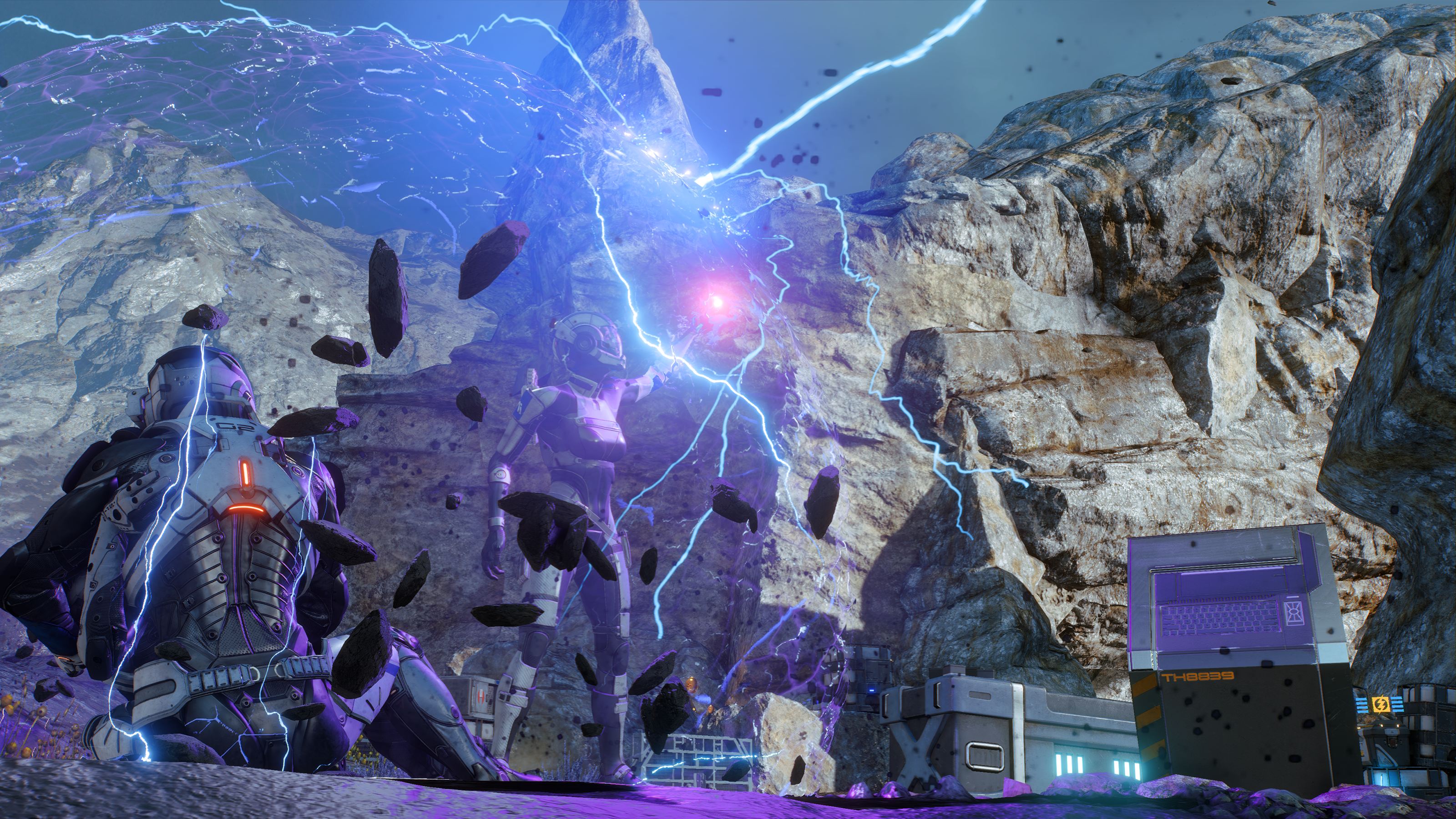 Cora rides a shuttle with Alec, Hayes, and Dr. Carlyle down to the planet. On landing, the Pathfinder scouts ahead while Cora and the others are assaulted by hostile native aliens. Liam Kosta and Ryder's child, survivors of the lightning bolt that destroyed their shuttle, soon arrive at their position and assist against the aliens. After a few more waves of hostiles, Hayes is injured and Dr. Carlyle attempts to assist, but an imminent lightning strike bears down on their position. Cora uses her considerable powers to form a biotic barrier powerful enough to withstand millions of joules of energy, and saves all three of them from getting roasted.