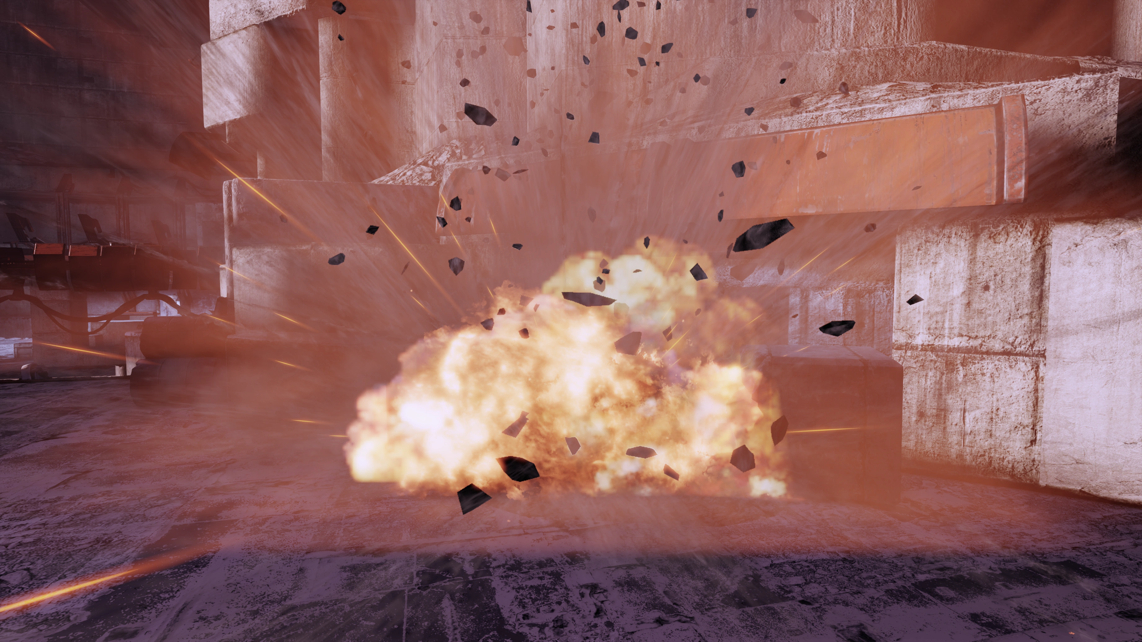 When you exit the bunker once again the geth will ambush you: an initial 2 Rocket Troopers in the catwalk, 2 Troopers and a Destroyer by the ramps. Reinforcements may periodically arrive from the door on the upper end of the catwalk, disgorging either Troopers or Rocket Troopers, though thankfully this isn't an infinite spawn situation. They really don't want you to get to Tali, or at least not before they can get to her. When the geth wave spawns you have a couple of options to kill the geth off: