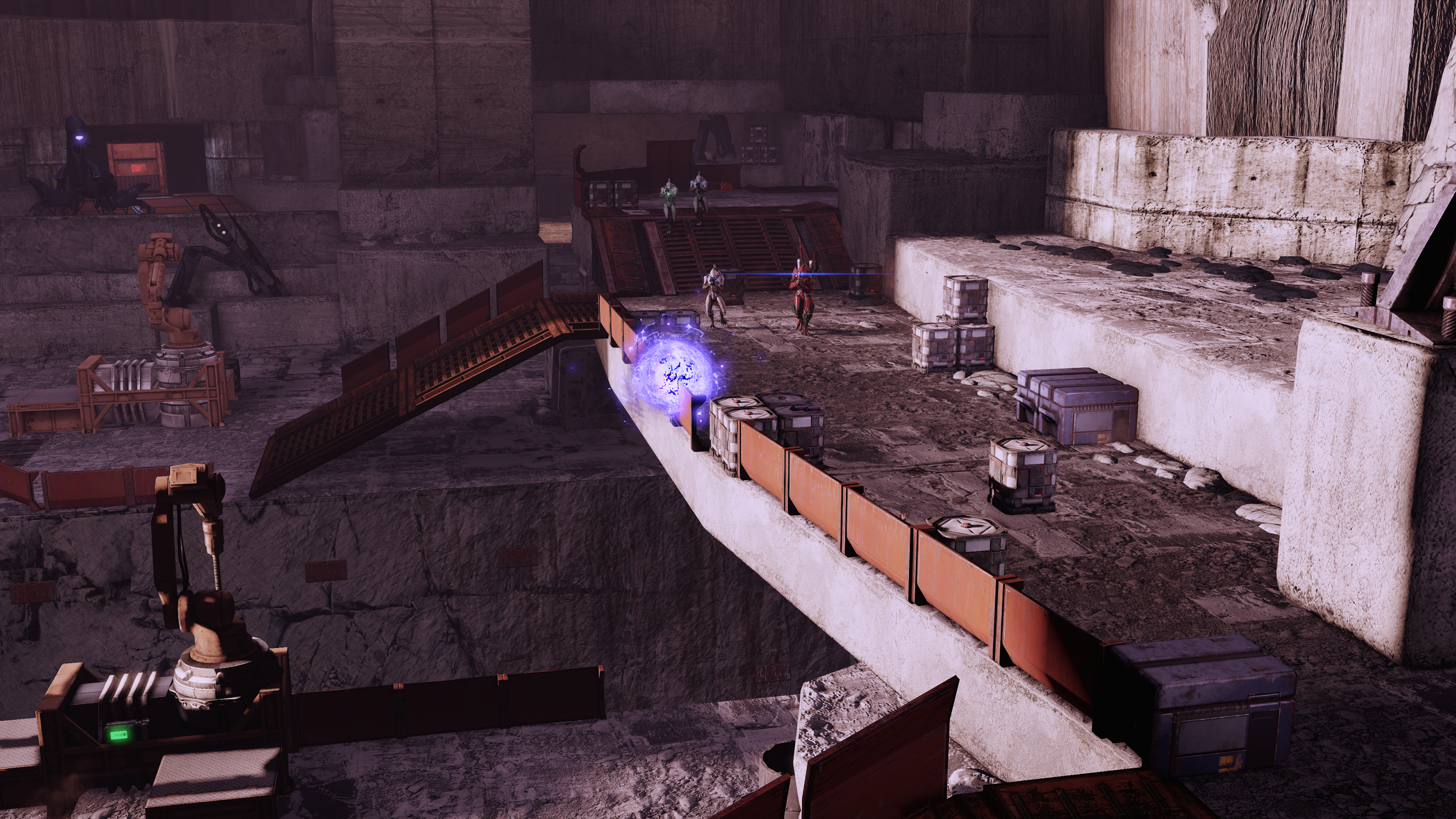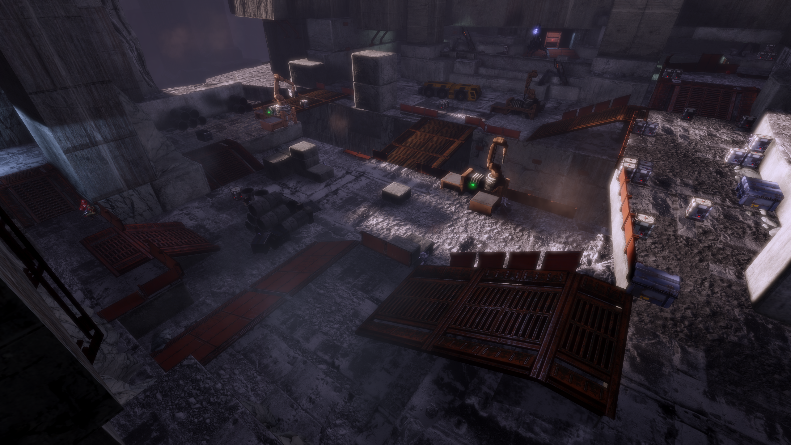 - Elevated Causeway / Up the Ramp: There are multiple waist-high crates you and your squadmates can lean out of once you reach the upper level. Aside from the initial two upper level Troopers, there is an additional Trooper charging in from the far side. The reinforcement door triggers earlier here, and you may end up having to scrap 11 or more Troopers. Trooper behavior here is to make a beeline to your location from the exit ramp on the far side while the Rocket Troopers hang back, and you'll face the latter only upon reaching line of sight around the ramp.