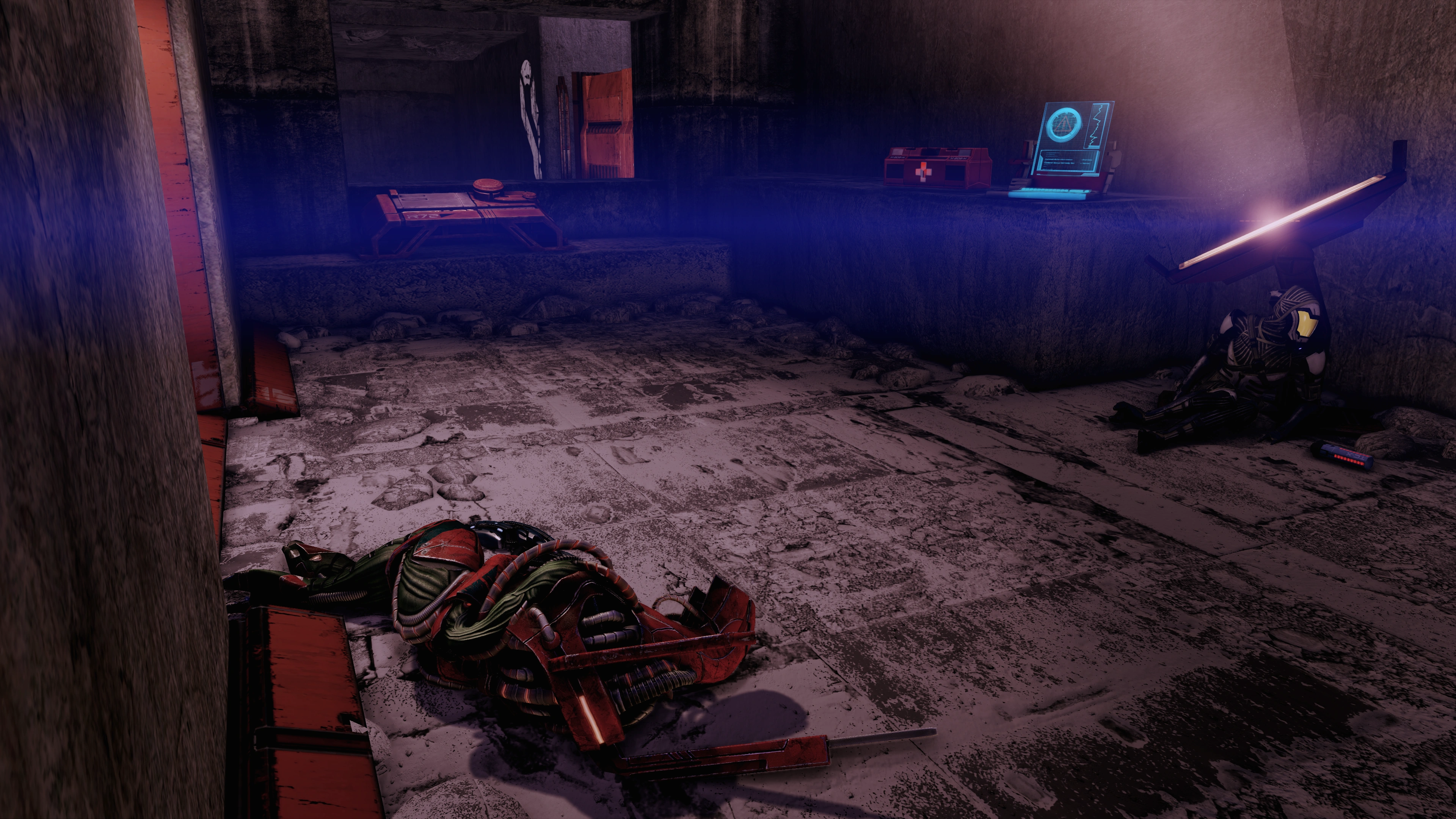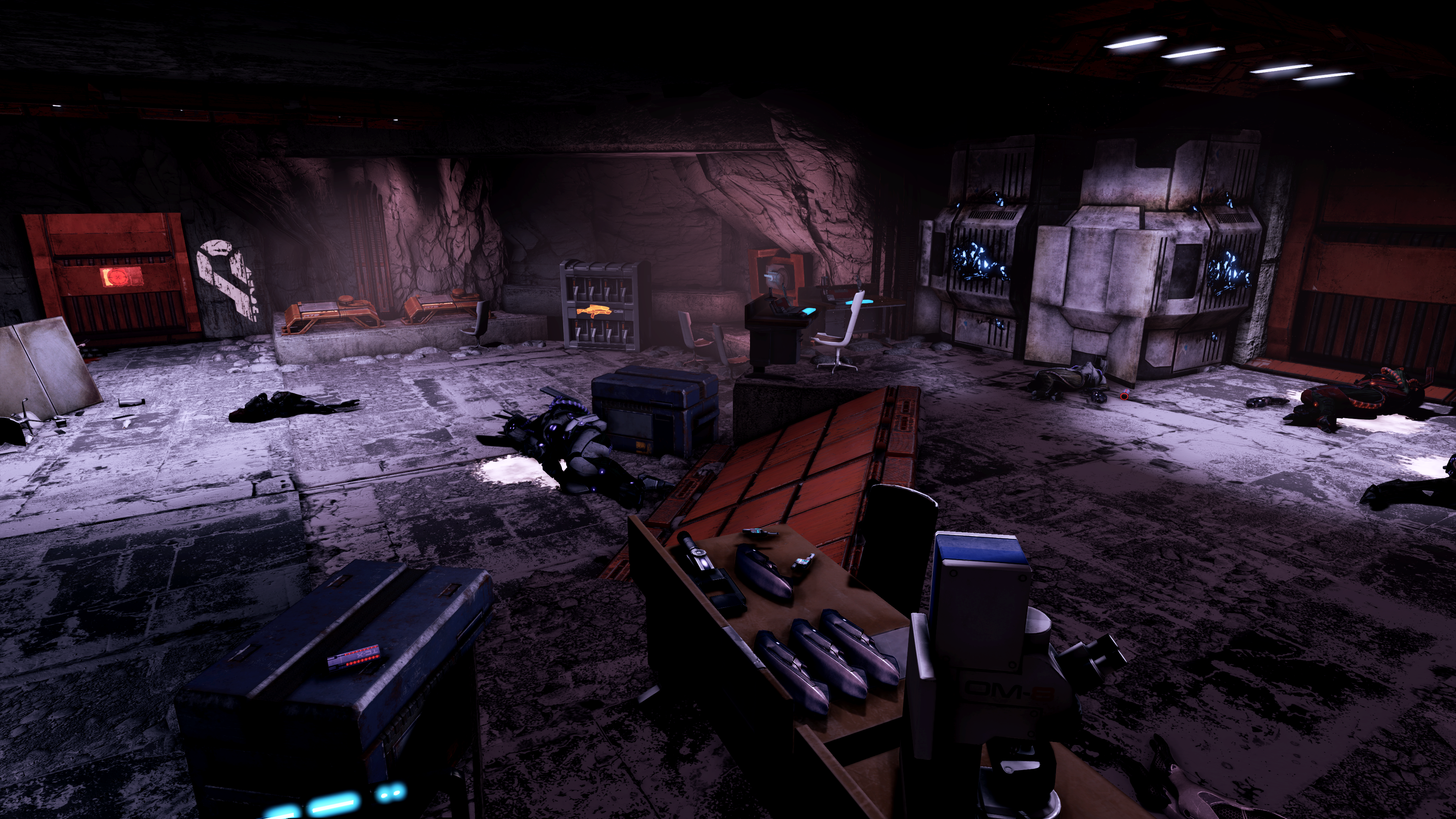 Past the door, on the right there is a medical station with medi-gel. Continue down the ramp but be careful as you approach the doorway. There are 2 Geth Recon Drones waiting just beyond, though they shortly activate camouflage and disappear without attacking, eliciting a comment from one of your squadmates and heralding the arrival of more drones that do attack.