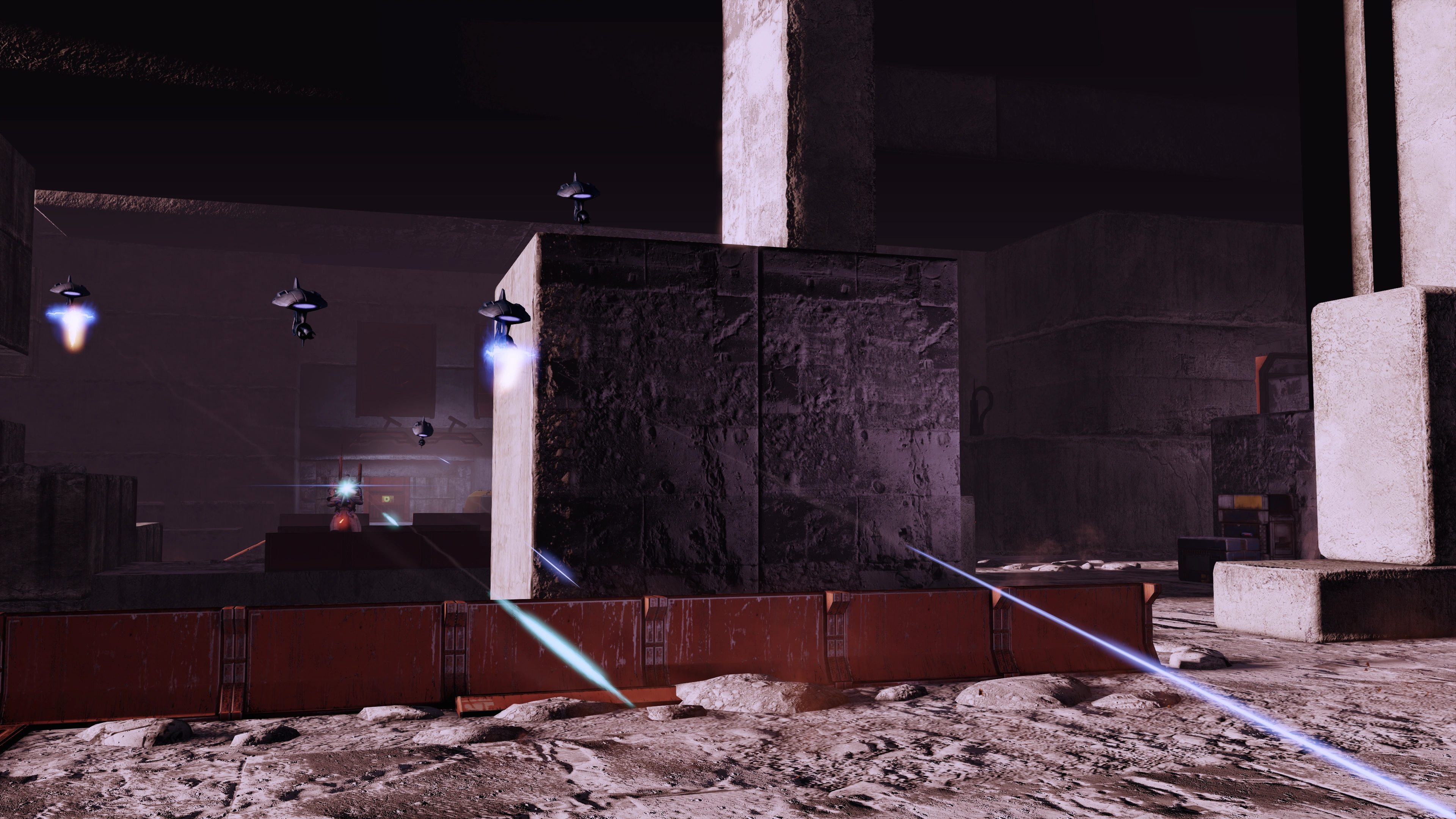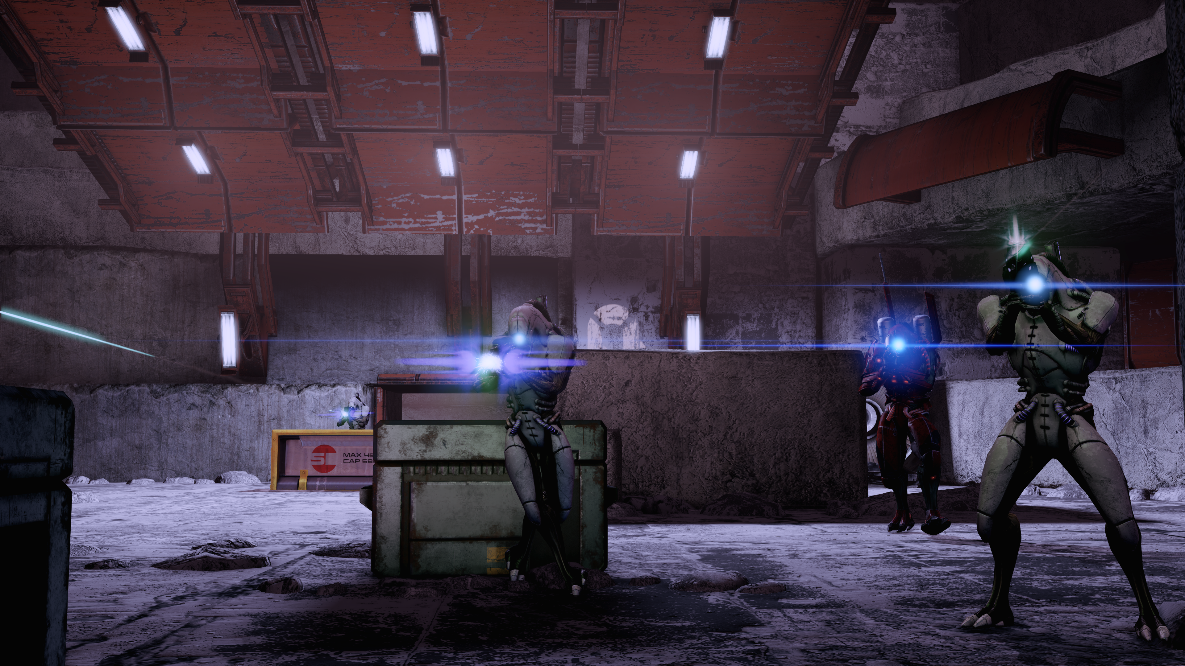 - Lower Level / On the Floor: Keep in cover and your squadmates will tell you that the sun is too bright and another way must be found. You can continue or ignore them. The two initial lower level Troopers emerge from the halfway chamber almost immediately after you dealt with the dropship troops, so there's no avoiding them even if you took the other route. When you reach the halfway point, the reinforcement door only triggers for the first time. The two upper level Troopers have no pathing solutions to the lower level until this point, then they will descend from the exit ramp of the upper level. Another Trooper will spawn from the upper level, and typically descend from the midway ramp. You really have little protection here, the farthest area secured from the sun and gunfire is by the ramp before the halfway giant block, so you may have to rely on waiting for the geth to come into sight from this position.