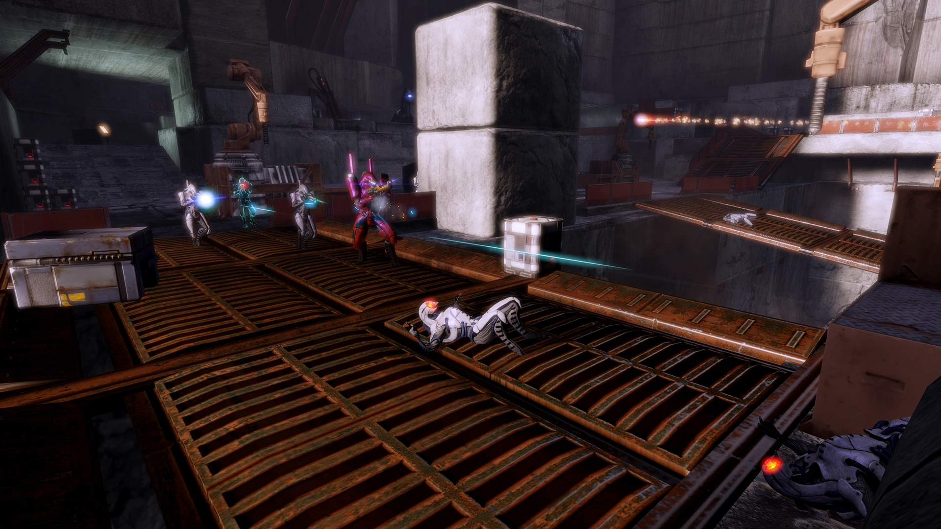 - The remaining Geth Troopers tend to stay to cover out in the room but will tend to break cover and storm your position once the Geth Prime falls. Kill the remaining Geth Troopers quickly or they will overrun your position behind the yellow vehicle.