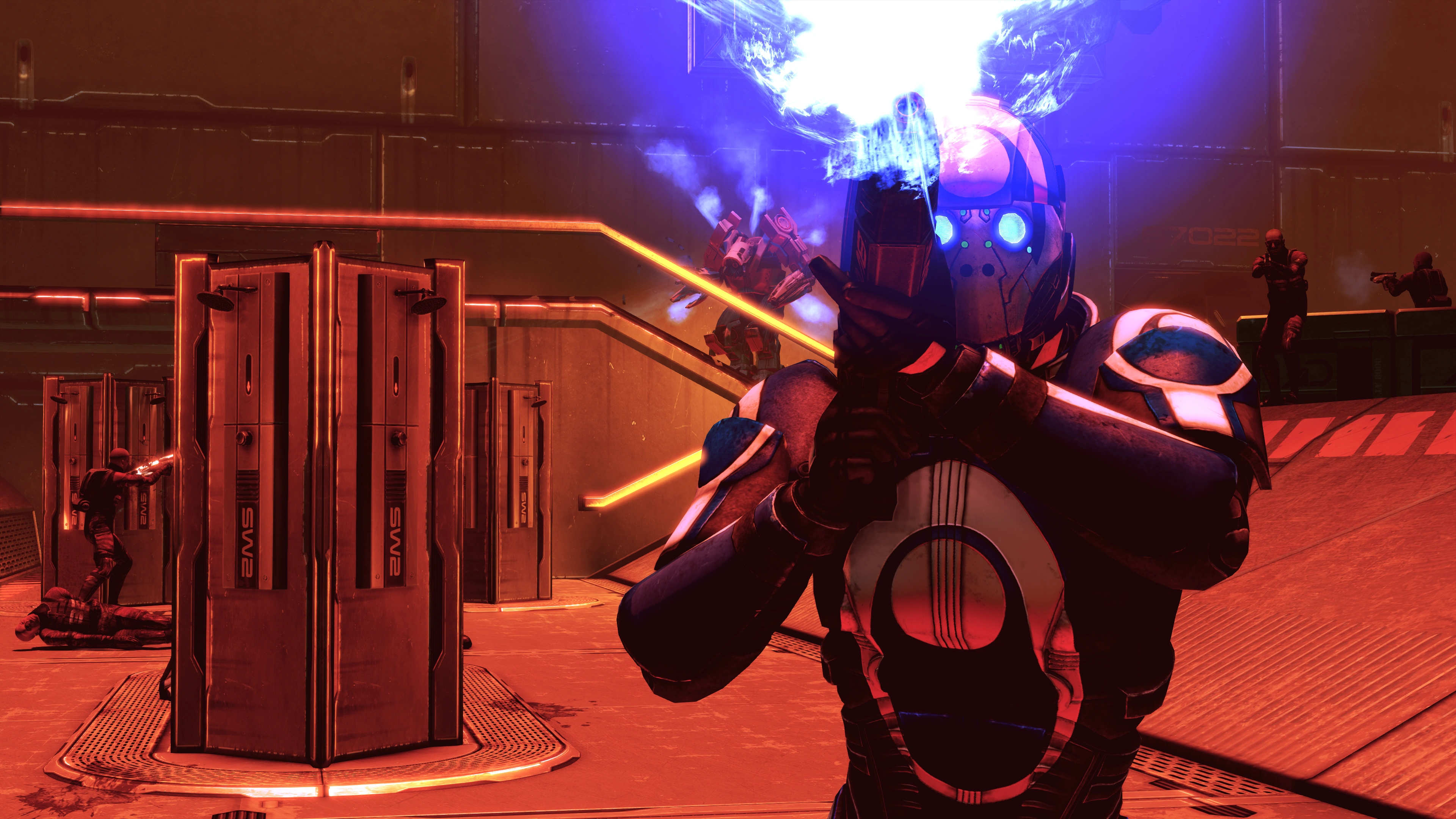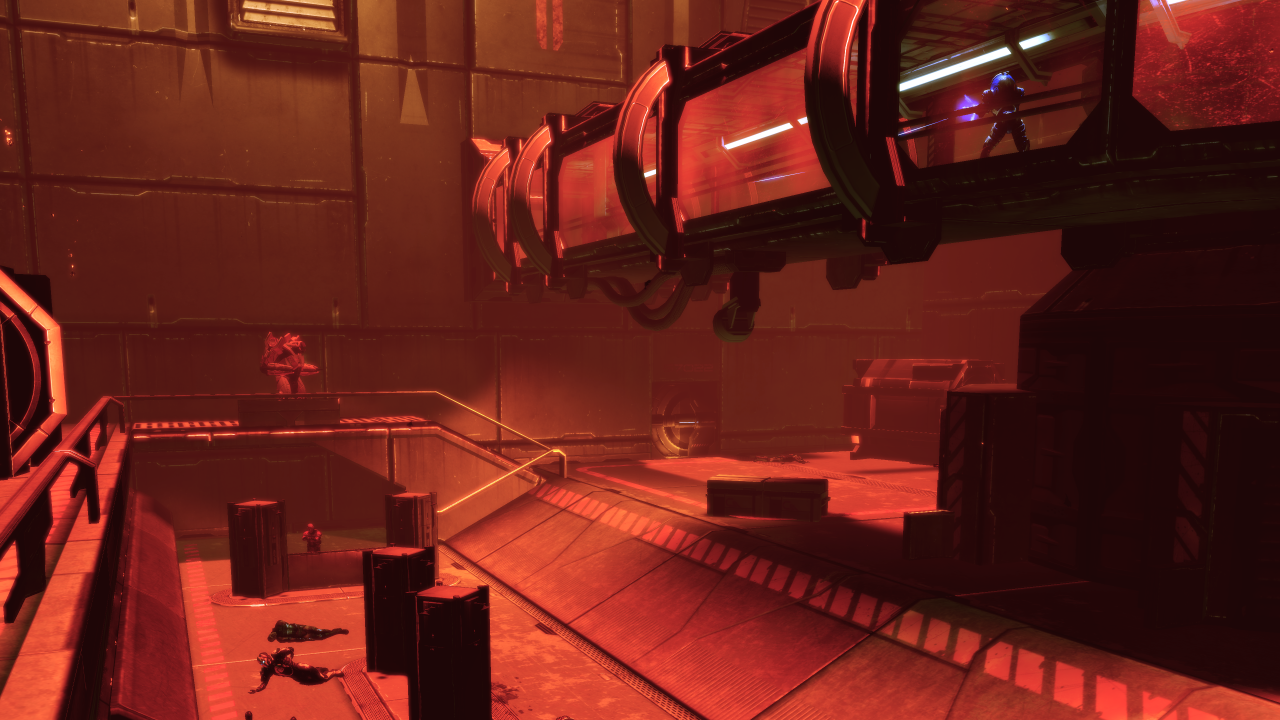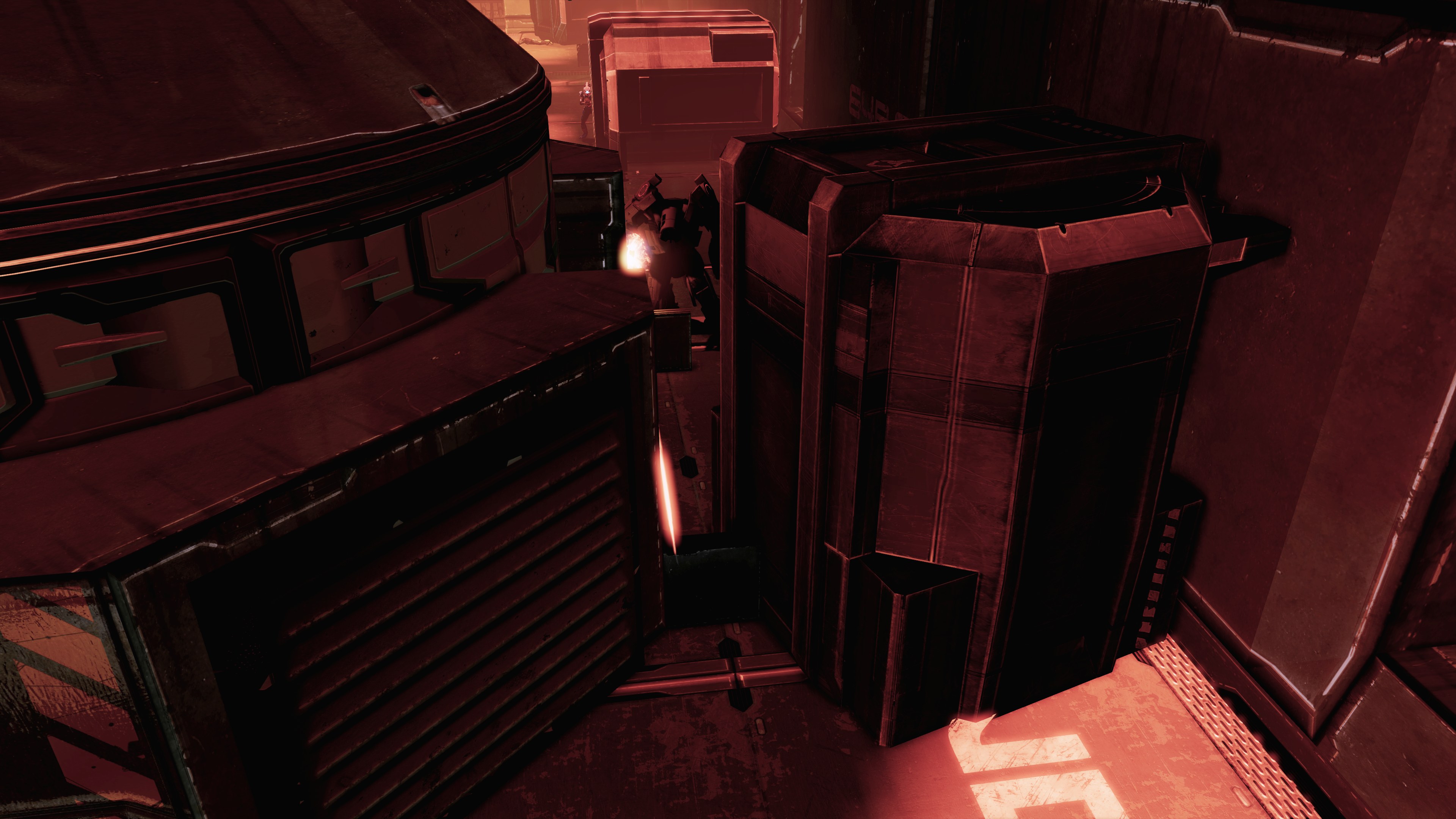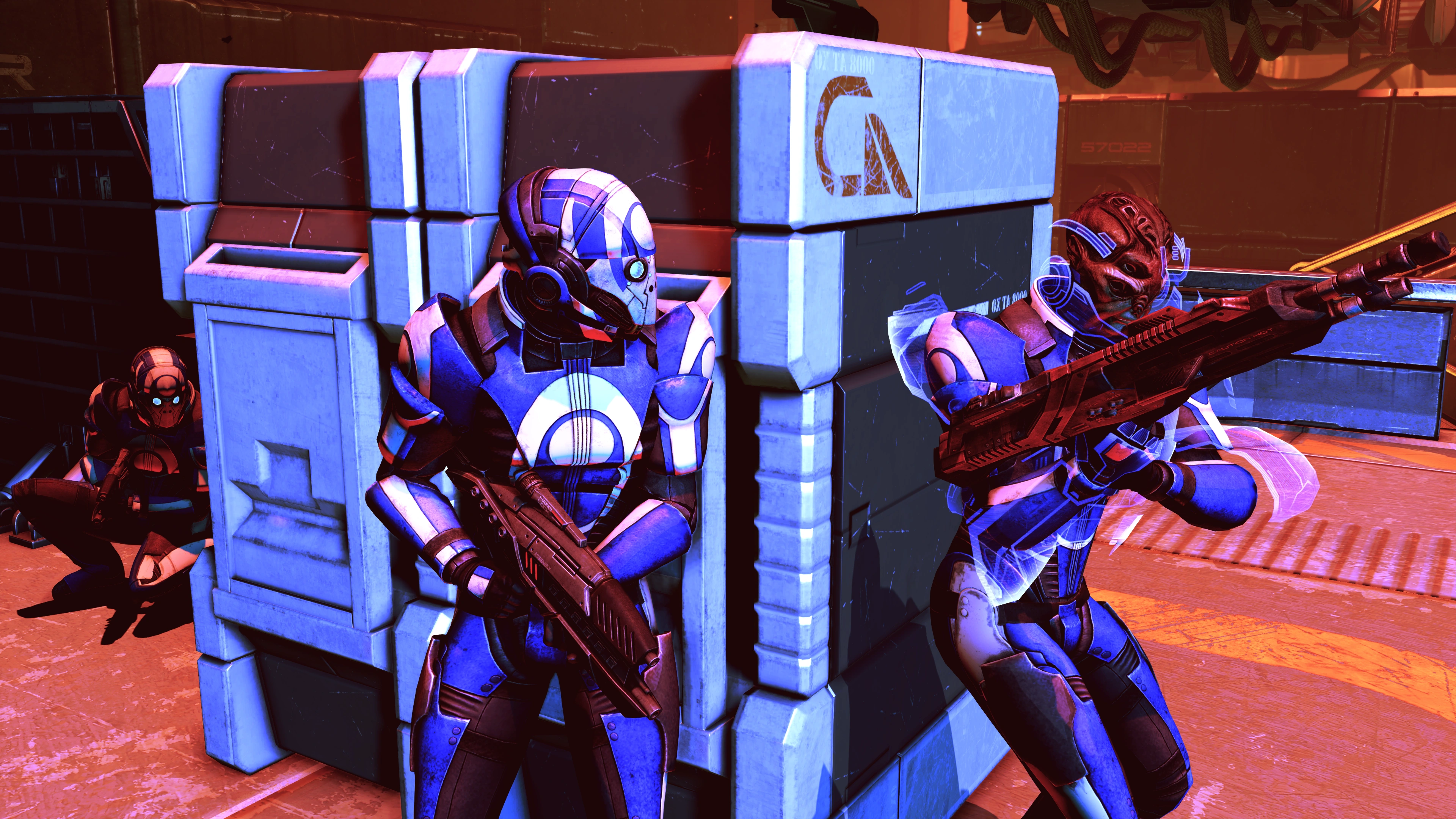 Move your squadmates up to the first support pillars on either side to provide cover and take cover yourself, either behind the crate or at the entrance to the tube. Big surprise: more mercs will try to take you down: a Legionnaire and three turian Troopers. There is no real reason that you should move your squadmates or yourself, as the mercs will just usually come at you, though in Mass Effect Legendary Edition they sometimes bizarrely all run away back to the room they start from.