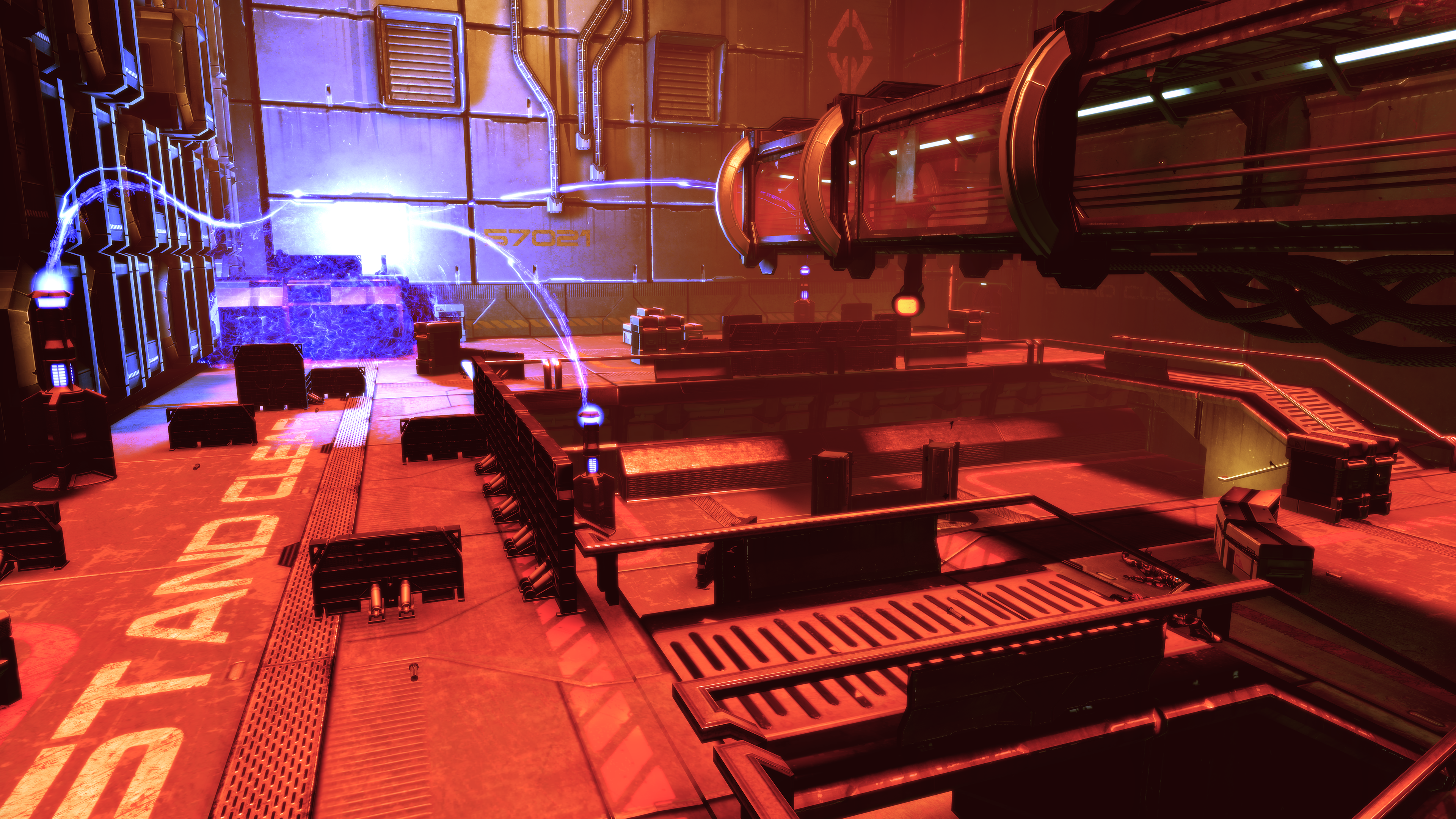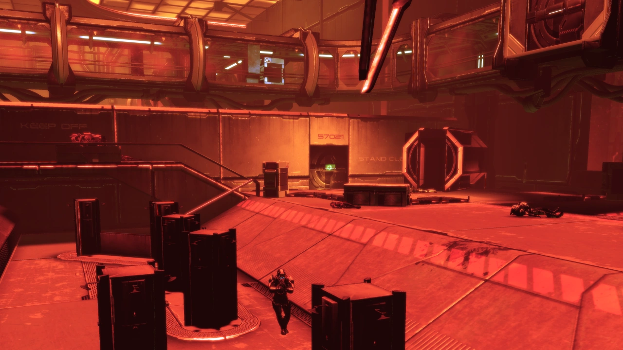 The left area (marked by the "STAND CLEAR" warning on the floor) is studded with barricades that pop up on approach, offering lots of protection from enemies that will be coming in from the far right. The right area has a bridge with flimsy cover, and you will be required to quickly neutralize any mercs at the other end and steal their cover boxes if you want to live. Fortunately, the right shield generator is within shooting distance even from the bridge and you can simply shoot it when you're secure.