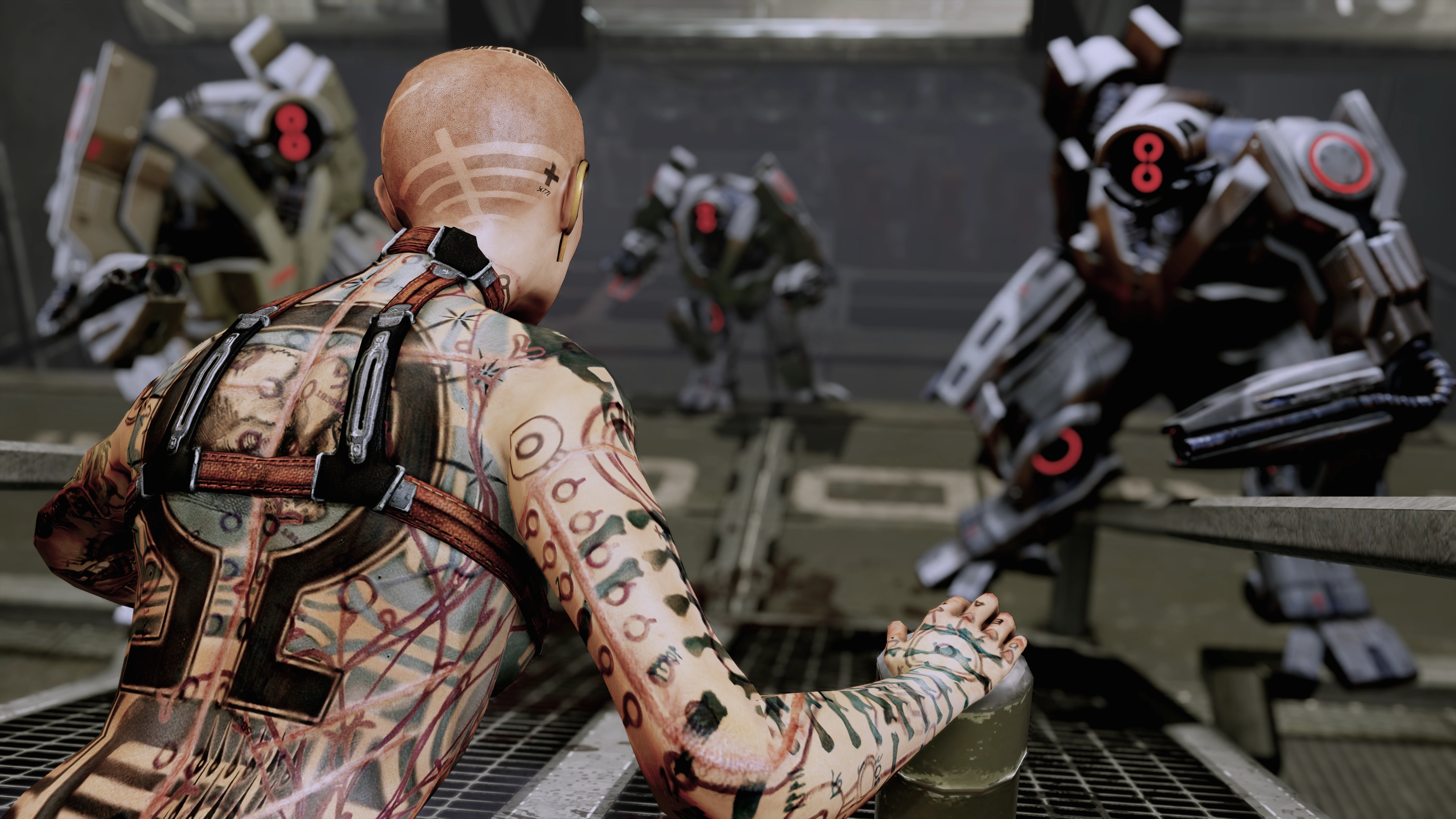 As you access the console, your squadmates tell you that this will override the security for the whole prison. It's also the only way to bring Jack out of cryostasis. You complete the procedure, and the cutscene goes on to show Jack's cell being pulled out of the ground. One of your squadmates will react incredulously when they see a highly feared and dangerous criminal is a skinny bald tattooed woman. She revives, seemingly angry at her incarceration. The three YMIR Mechs guarding her cell are apparently no deterrent for her, as she breaks her restraints, unleashes her massive biotic powers on the YMIRs, and escapes. Now, it's a chase.