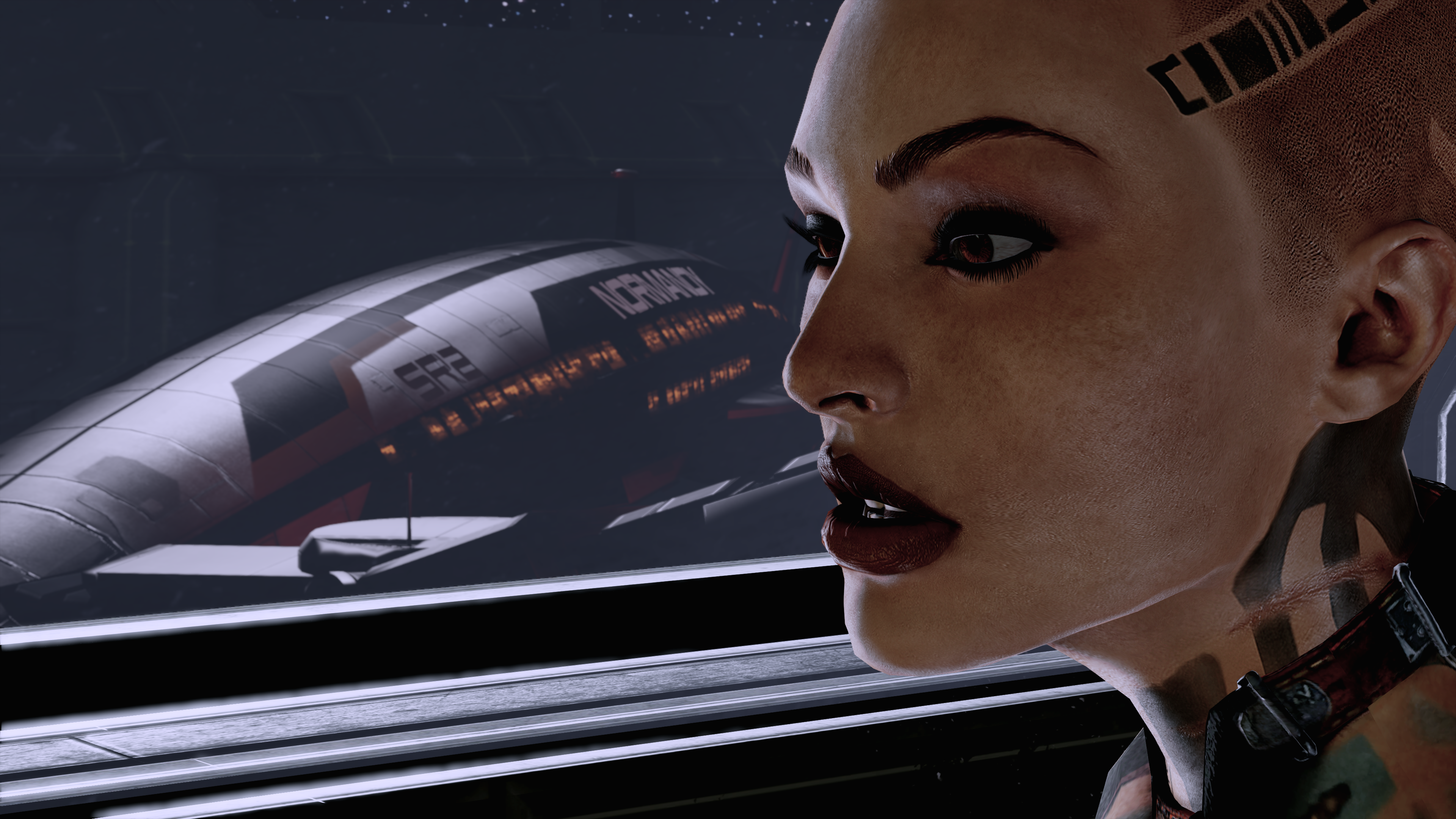 Jack, however, has also been busy and has reached the airlock. The guards try to stop her, but her biotics take them down before they have a chance to even raise their weapons. Apparently, the large ship out the window draws Jack's interest, but she spots the Cerberus logo on the Normandy's bow planes. That sends her into a fit, allowing a batarian guard to sneak up on her, but before the guard can do anything he gets a shot in the head from Shepard's pistol. Jack spins around, and a conversation begins.