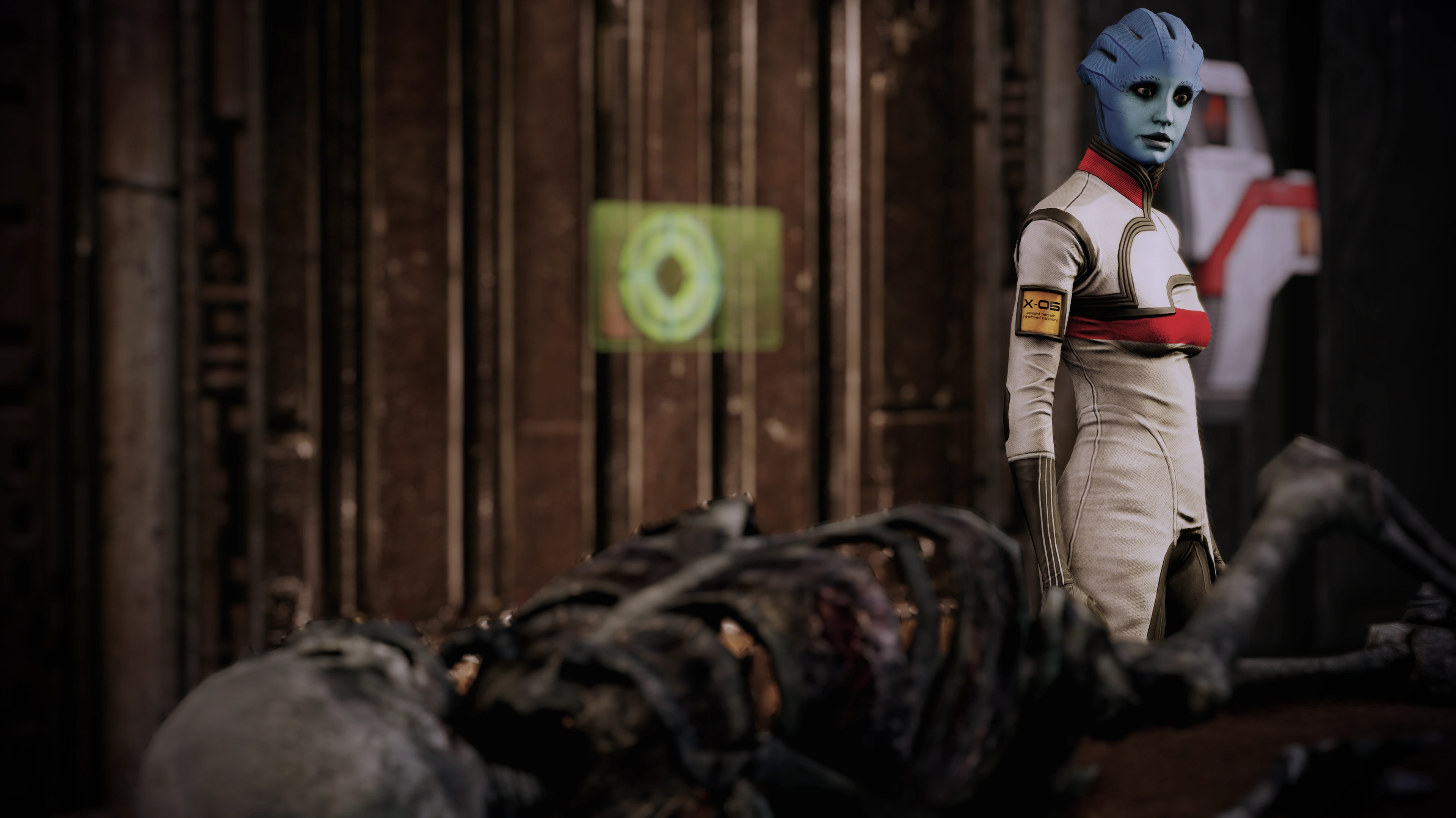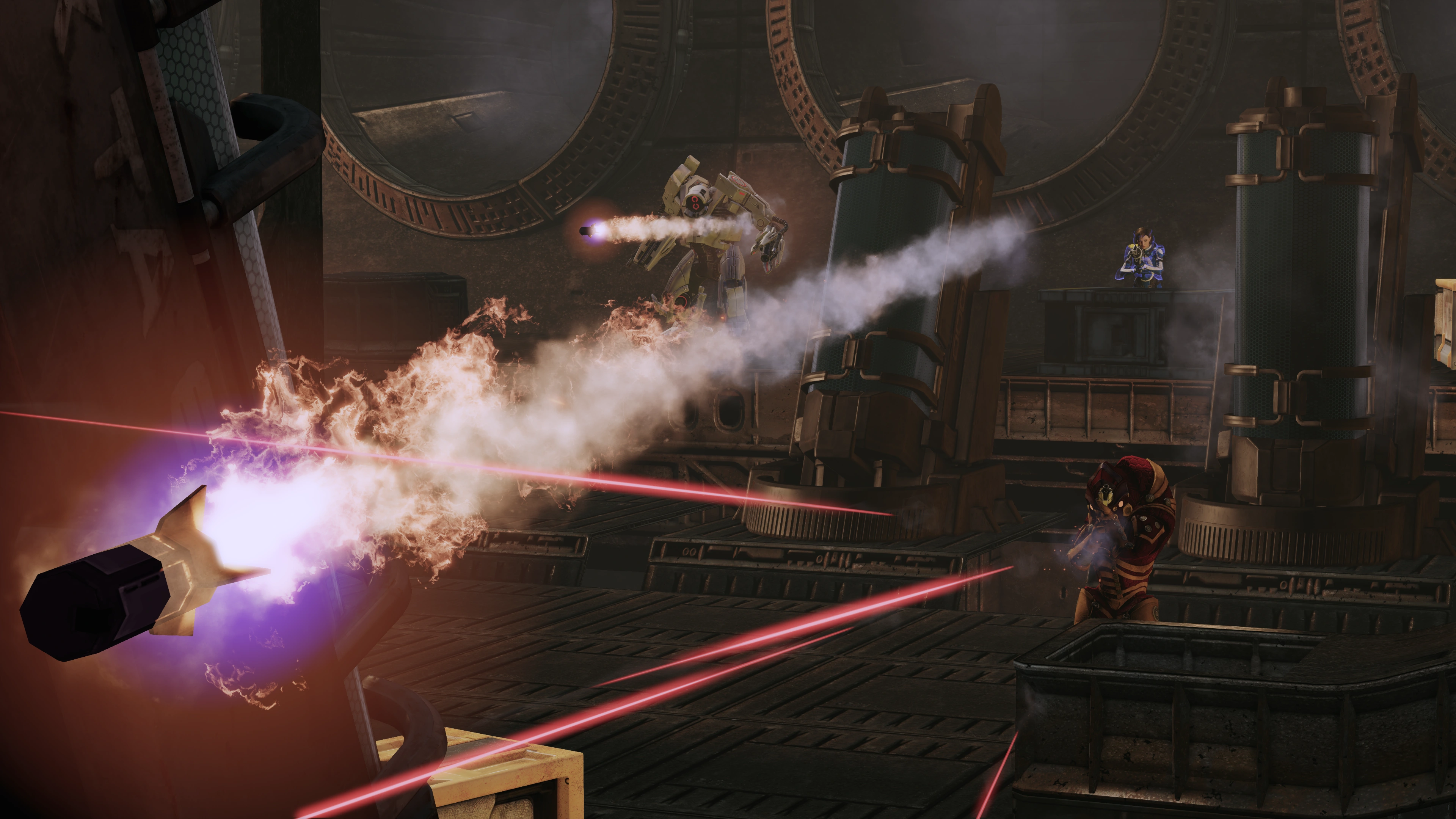 Alternative Strategy: A safe—though probably more tedious—way to conduct this fight is not to enter the room at all. The door has a very short closing threshold; barely two steps in either direction and it will close. The krogan will come one at a time and can leave the room if the door is open. The YMIR will probably not leave the room because it can shoot at you from inside. Jedore will not leave the far side of the room to close distance because she is using a rocket launcher. Therefore, if you can handle one krogan at a time, you can just wait outside the room and let the door shut to have respite at any time.