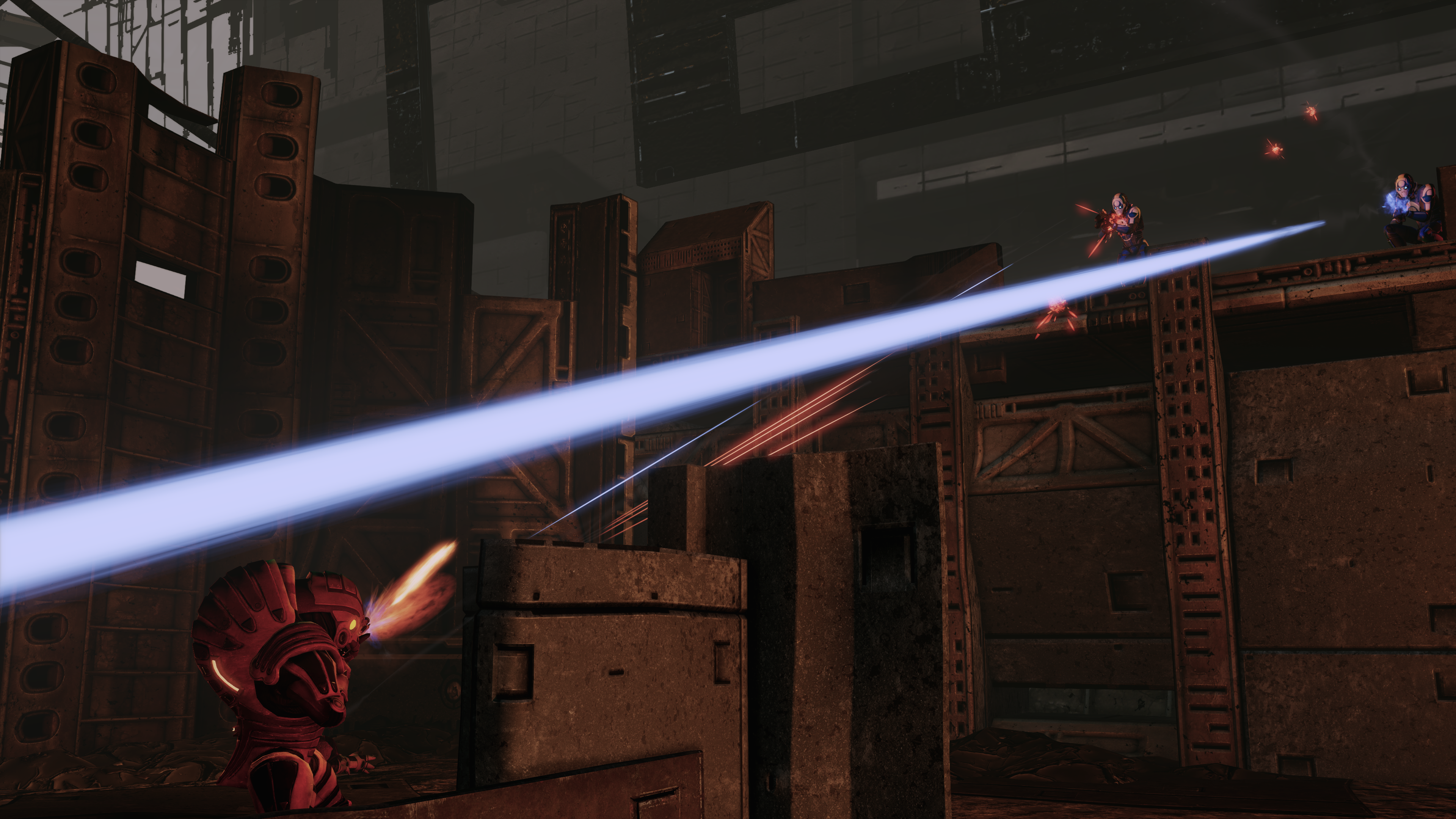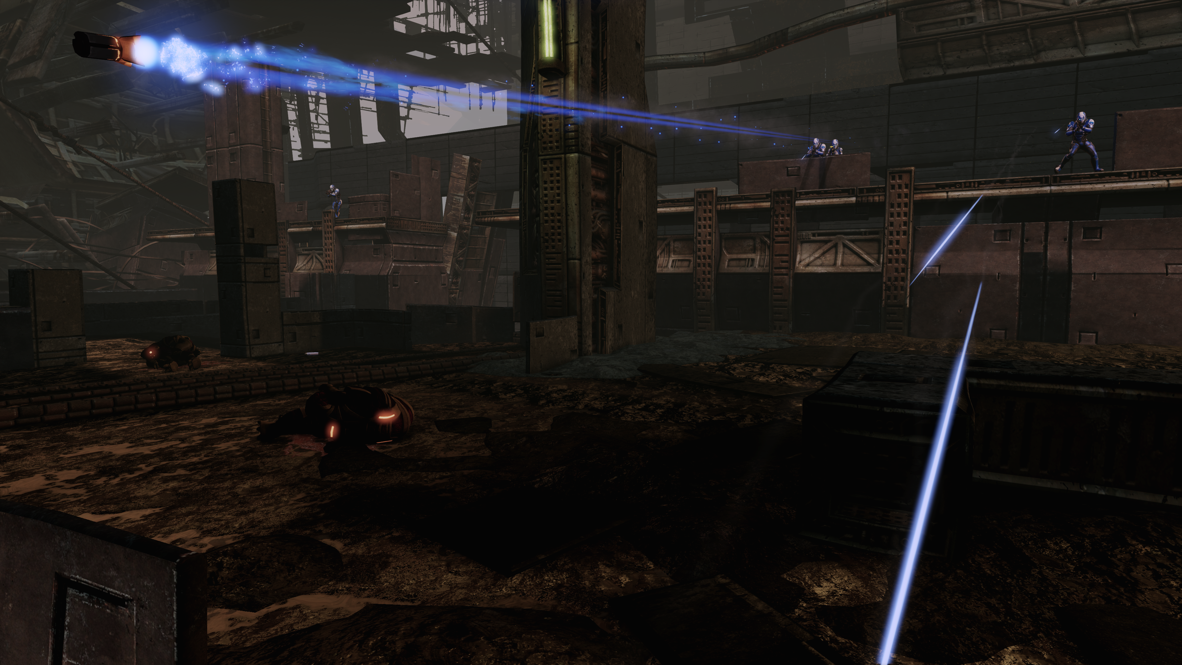 This is yet another challenging area because the enemies here will continue to spawn for quite some time, initially alone then in pairs, approximately ten in total. On Insanity they will all be Krogan Berserkers, but on lower difficulties the earlier enemies will run the gamut of the Blue Suns arsenal except for Commanders. You have the choice to try to hold and kill them all, or stop them spawning by gradually advancing past their spawn point. There is a medkit on one of the platforms next to a dead Blue Sun merc. Tip: It is even possible to avoid fighting the enemies entirely if you are quick, flexible, and follow the correct path (left branch first, then right branch). This is a viable approach even on Insanity, and once the timing is learned can be done consistently and doesn't require special abilities. Walk when krogan aren't shooting you, run when they are, and take cover briefly in the middle.