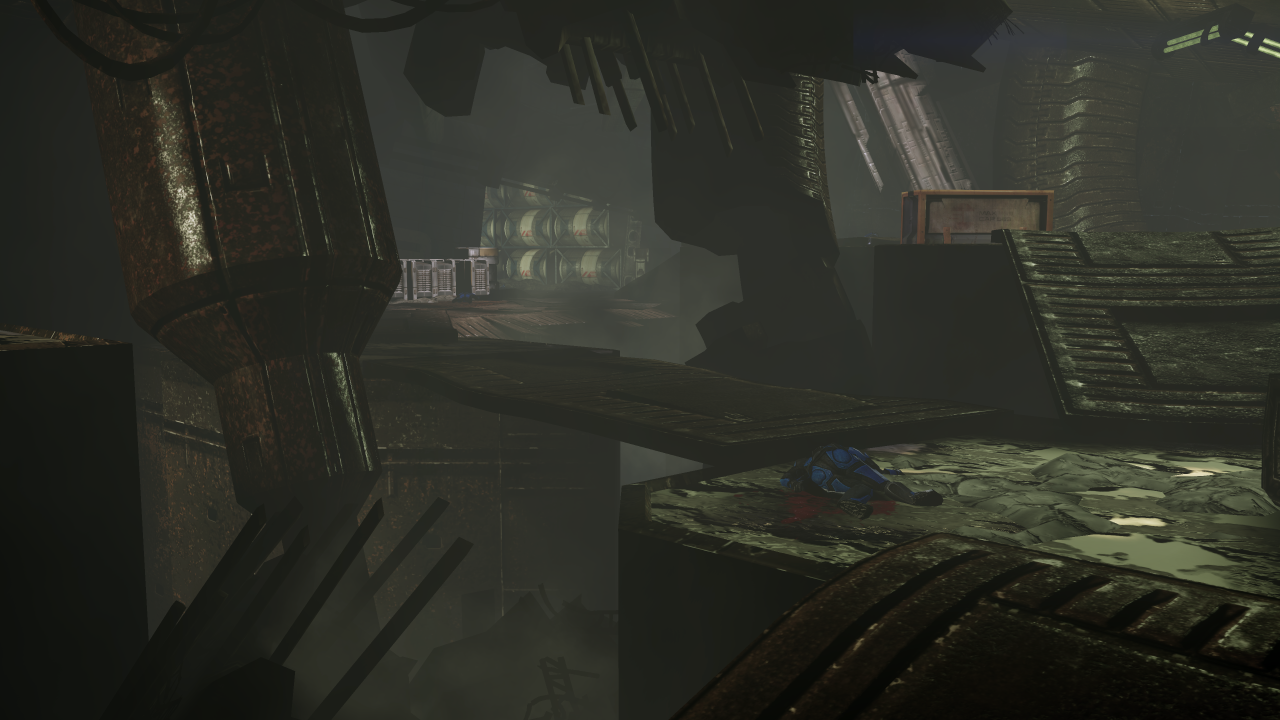 Once past this trap, you must pass through an oddly-shaped passage: multiple raised platforms joined together by metal slabs, with very little real cover and a lot of breakable crates you can lean out of once or twice before some stray bullet destroys them. There are two paths, though they converge in the middle for two platforms before splitting off again. The other side can be reached in 4-5 platforms depending on route taken.