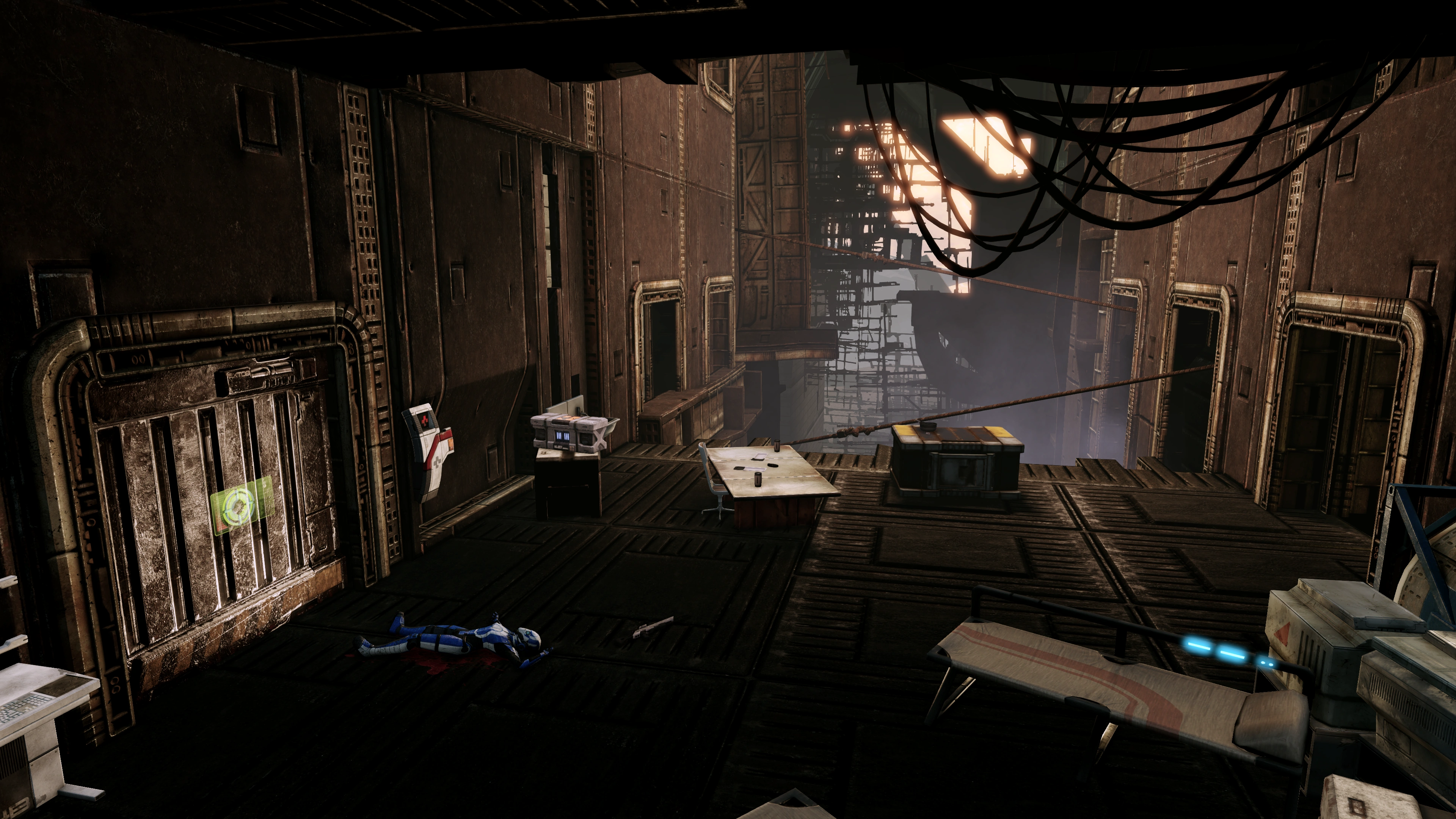 Beyond the door is another flight of stairs up, and another generated autosave. Over loudspeakers Jedore orders her men to kill the trespassers while she deals with Okeer, who has been releasing tank-breds without authorization. There are two doorways above, but one is barricaded. There's also a med kit near some sleeping cots in front of the doorway. The area is full of waist-high cover but protection goes both ways as your enemies are likely to have initial control of them. Enemy composition is initially a few Troopers and Heavies, then Blue Suns Legionnaires. When you advance a little further to the L barricade some more Troopers and Centurions show up on the far side. Again with all the bullet and missile spam you'll probably be spending a lot of time leaning out to fire or use your powers instead of a running battle.