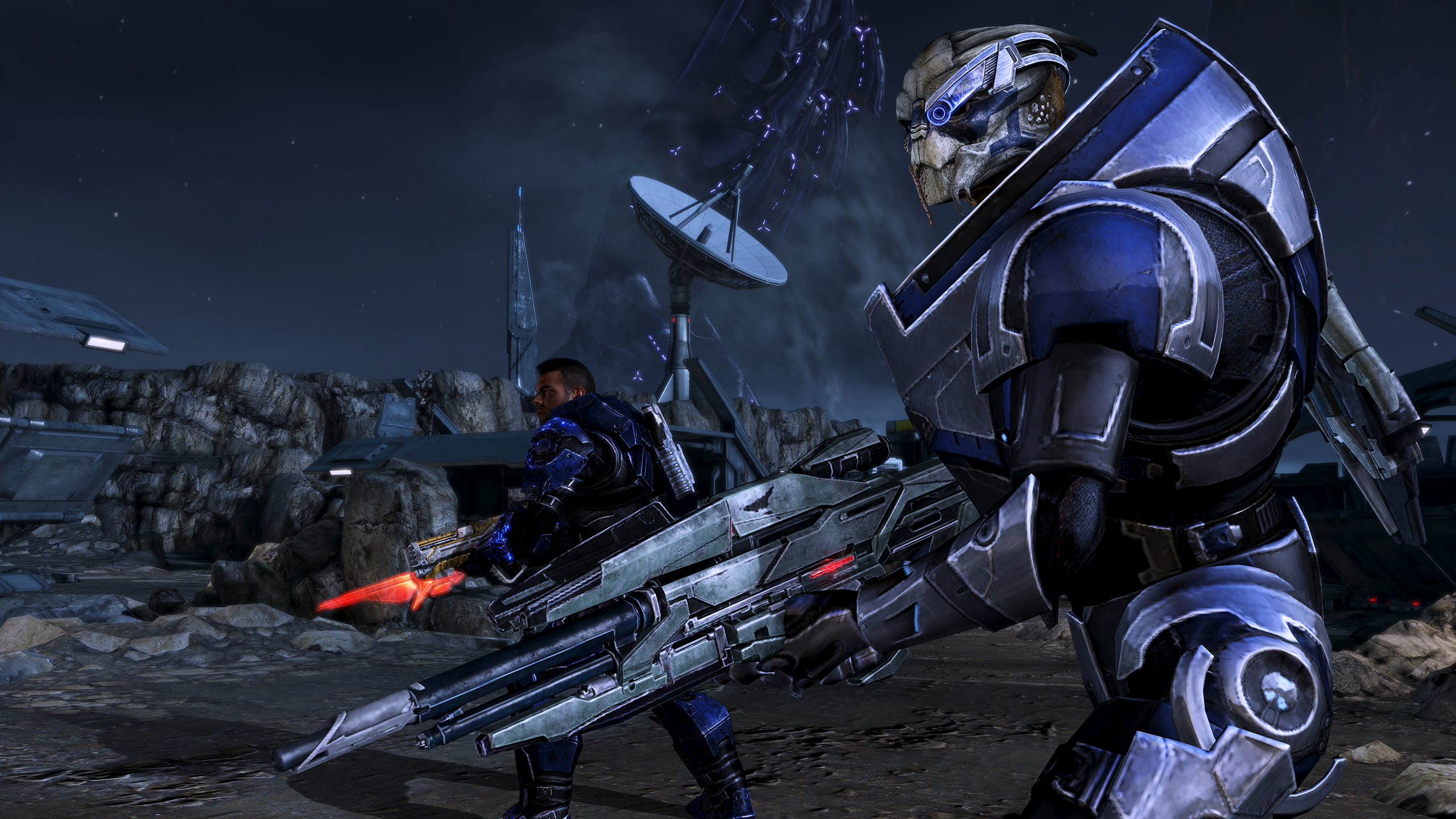 Moments after the mission on Tuchanka to cure the genophage, Garrus advises Shepard to take some rest; they both know there's no room for mistakes in the war. In the interim, he has taken up the job of coordinating several dry-dock ships from the Hierarchy for helping in the Crucible's construction.
