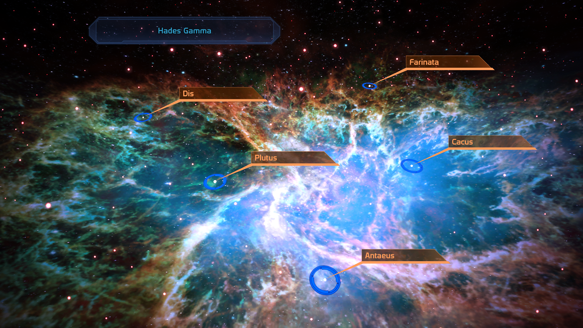 Hades Gamma is a cluster in Earth Systems Alliance Space, situated along an outer arm of the Milky Way. The Anansi-Ishtar shipping lane passes through the Farinata/Cacus side of this cluster, passing near to Farinata and uses Treyarmus as a convenient discharge point. Quarian starships often take advantage of the heavy shipping traffic near Treyarmus to sell salvage or refreshments; the number of merchant vessels along the Anansi-Ishtar route also makes it a popular 'hiding place' for any unregistered ship wishing to obfuscate its signal.