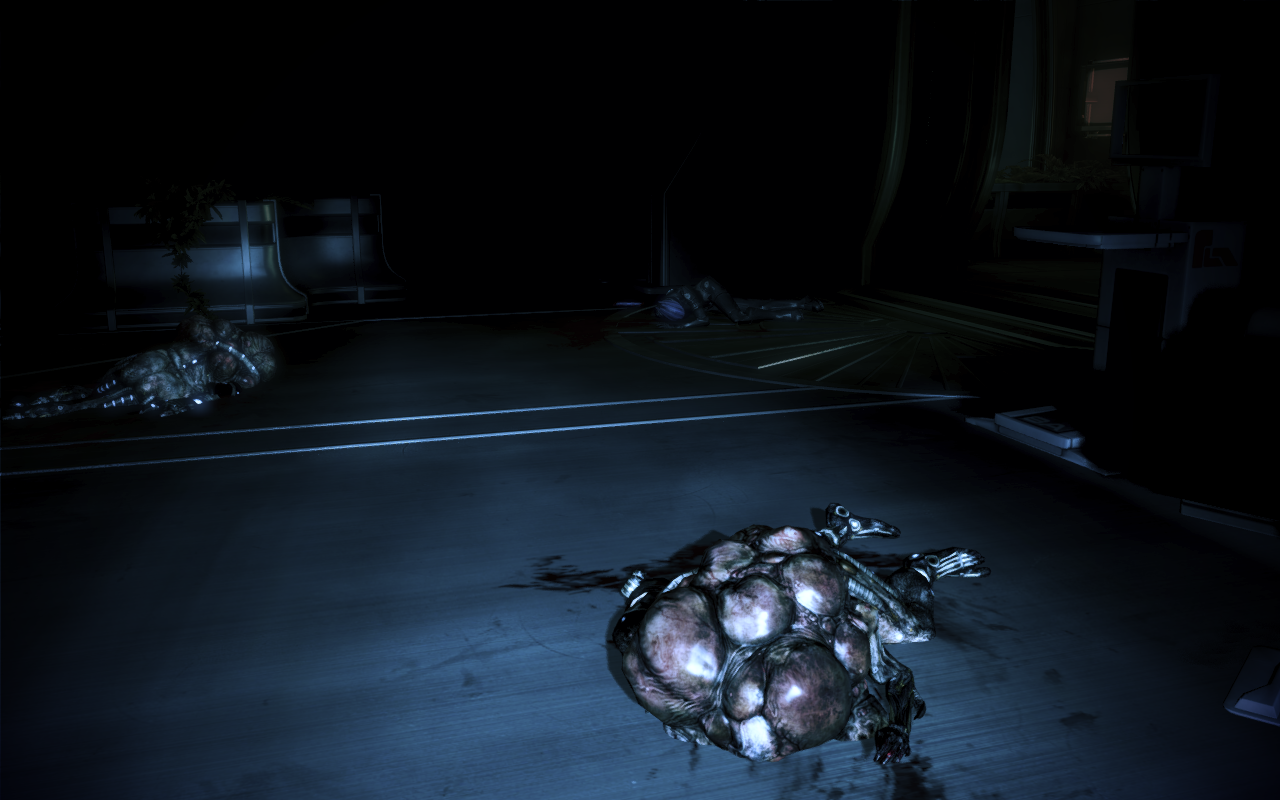 Your best bet is to take out all of the Husks before the Banshees start teleporting across the room by using powers or weapons that have a large area of effect (e.g. the Venom Shotgun or Singularity); triggering a Power Combo or letting fly with grenades is also very effective. Then, try and get your squad members to draw the attention of the Banshees long enough for you to take them out. Stay away from the monstrosities at all times, running to the other end of the room whenever they get even a little close. Make free use of medi-gel to keep your squadmates active when they fall and to keep your own health up if you get hit by the Banshee's ranged warp-like attacks. Using multiple powers is a good way to get Banshees to stop teleporting, at which point you should shoot at their heads. Again: don't let a glowing Banshee get close if you don't want to suffer a painful death. In the Wii U Version, an M-597 Ladon can be found here.