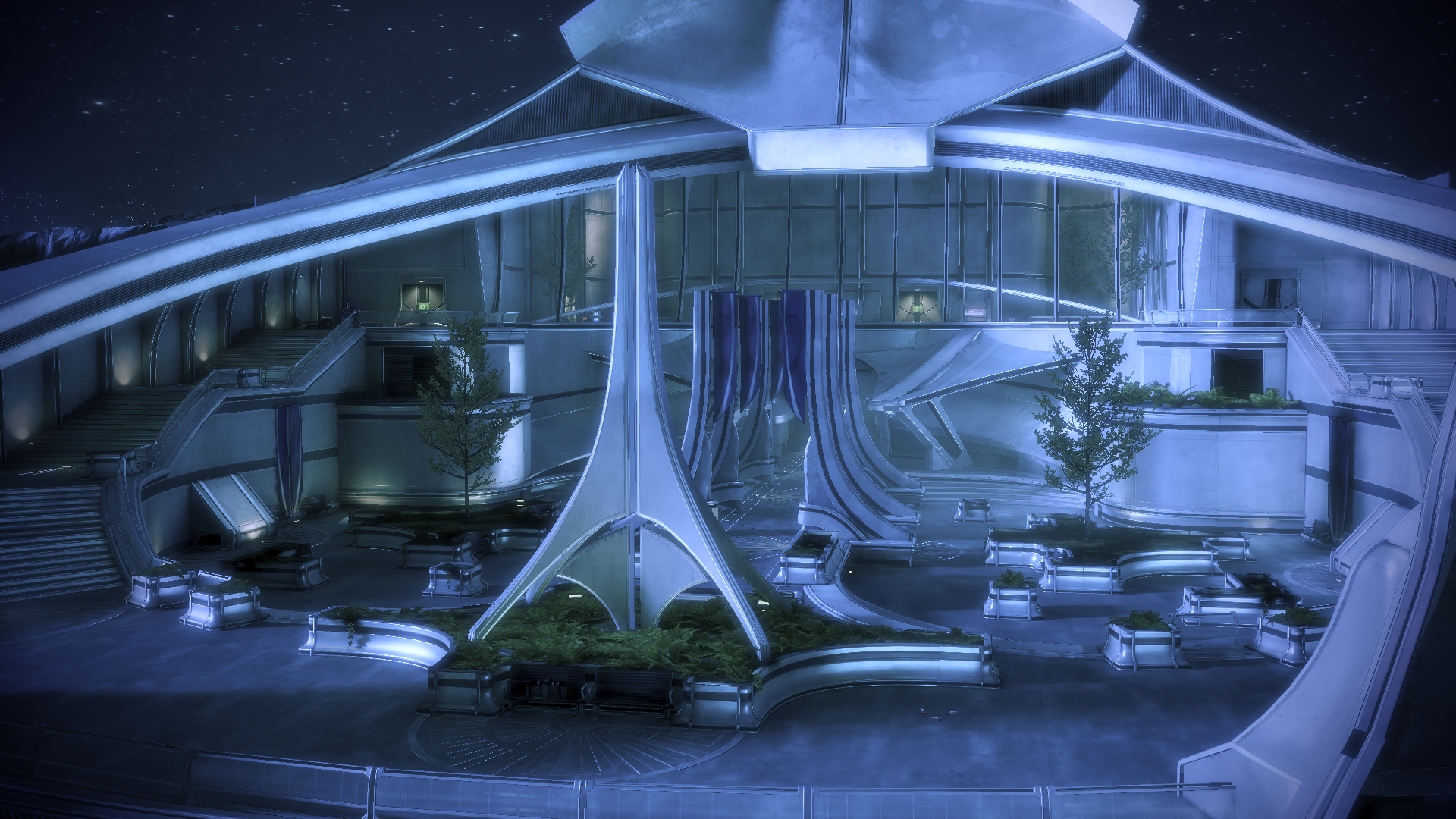 You can then go down the stairs, where you will encounter another Banshee and several Cannibals. This fight is significantly more difficult than the first fight with a Banshee, because there are not a lot of options for cover until you take out some of the Cannibals, and the Banshee has a habit of following Shepard around. The engagement can be less hazardous if squadmates are told to hold position at the top of the stairs and Shepard retreats to join them when the enemies appear. Once it's dealt with, though, the grand staircase is a great place to defend from.