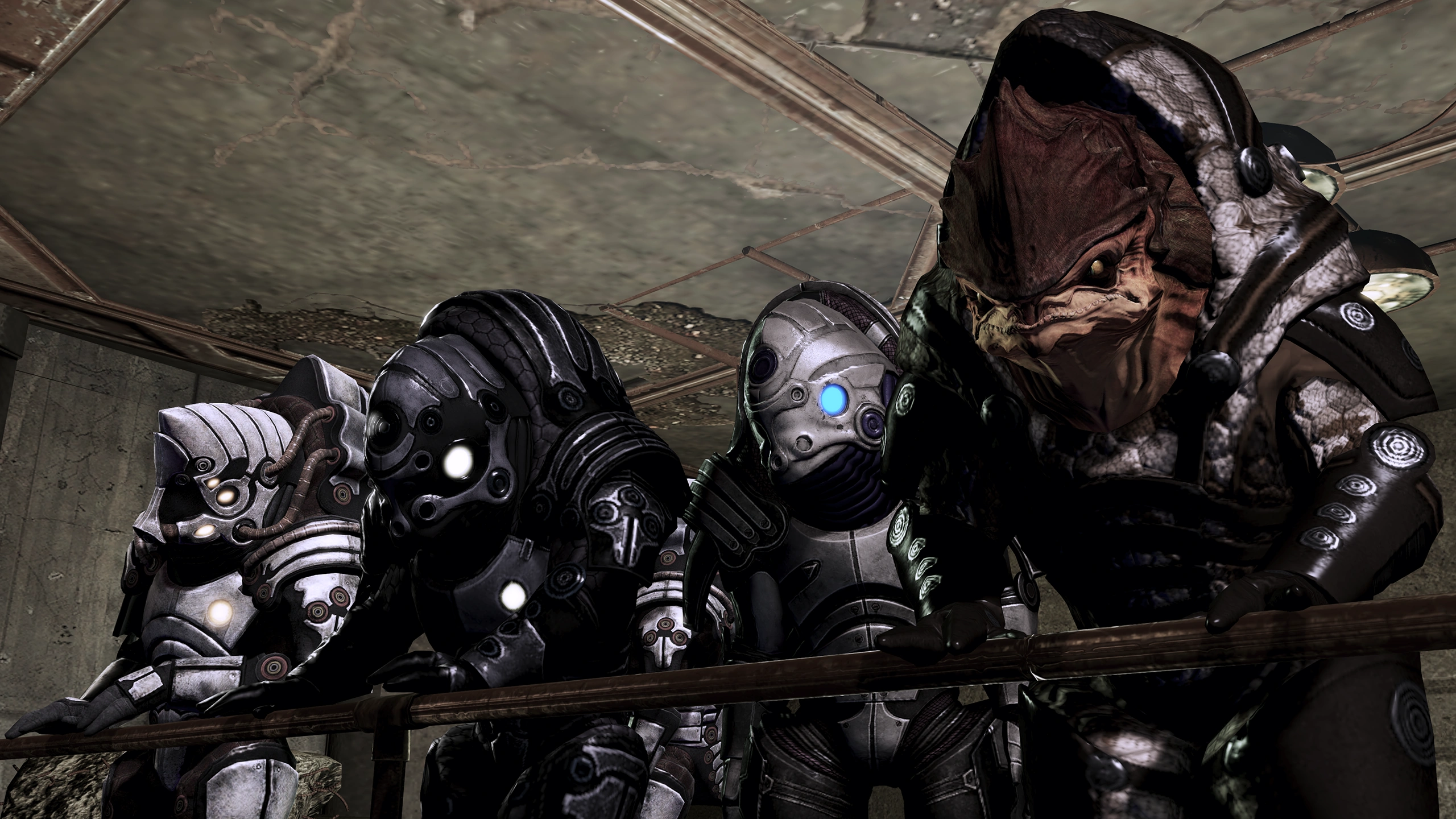 But the salarian intervention was not without an ulterior motive. At the time the Citadel was engaged in a prolonged galactic war with the rachni, a race of intelligent space-faring insects. The salarians hoped the krogan would join the Citadel forces as soldiers to stand against an otherwise unstoppable foe. The plan worked to perfection: within two generations the rapidly breeding krogan had the numbers not only to drive back the advancing rachni, but the ability to endure the harsh conditions of the rachni worlds. They were able to pursue them to their home worlds, find the rachni queens, and eradicate the entire species.For a brief period the krogan were hailed as the saviors of the galaxy and were given not only the conquered rachni worlds but other planets in Citadel space to colonise, in gratitude for their help. The Citadel Council even commissioned a statue for the Presidium—the Krogan Monument—to honor the krogan soldiers who died defending Citadel space.