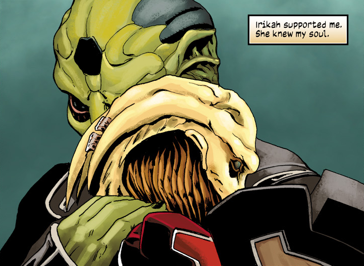 Irikah demands to know who Thane is, having determined he isn't one of the intruders. He confesses to be the sniper Irikah foiled earlier. She is about to call the lab's security when Thane pleads for redemption by her hand.