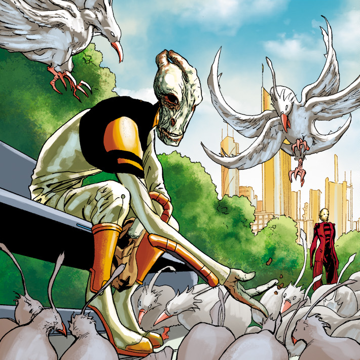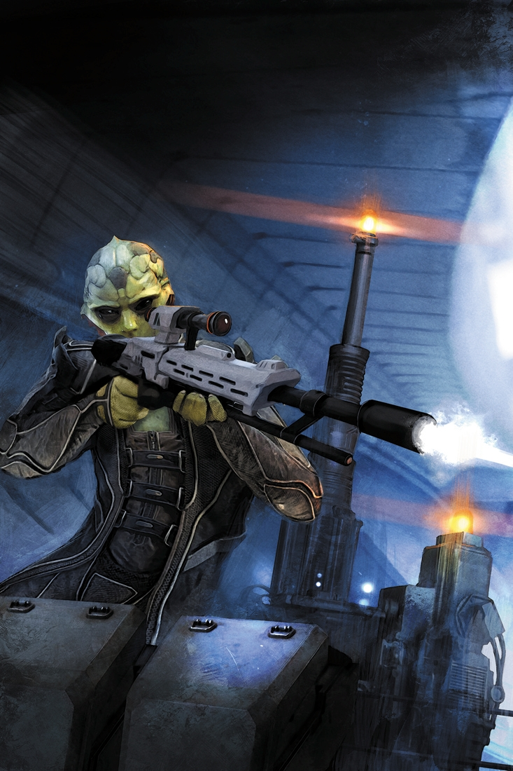 On a high-rise building with a sniping point to a park below, Thane readies his rifle against the target he was paid to kill: an old salarian war criminal who went into hiding. Unaware of the incoming hit, the salarian goes about his business of feeding the park's birds. The headshot is ready but a stranger suddenly appears in front of Thane's scope: the drell who would become his future wife Irikah. Irikah warns the salarian of the danger and gives him enough time to run while Thane recoils away from his gun.