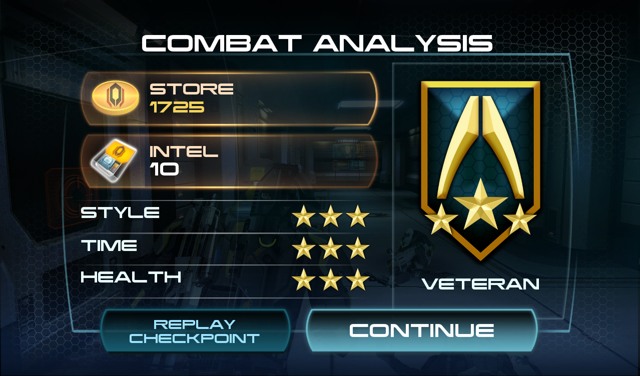 After reaching checkpoints in the course of completing missions in Mass Effect: Infiltrator, player performance is evaluated by a scoring system called Combat Analysis. The Combat Analysis screen also provides the player's current Credits and Intel Points totals.
