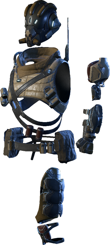 There's nothing elegant about this patchwork hardsuit. It mixes various materials and technology from the Heleus Cluster and its microframe computer runs a jumble of barely linked programs. Despite this-or because of it-the armor is highly effective in combat, with targeting and thermal distribution systems second to none.