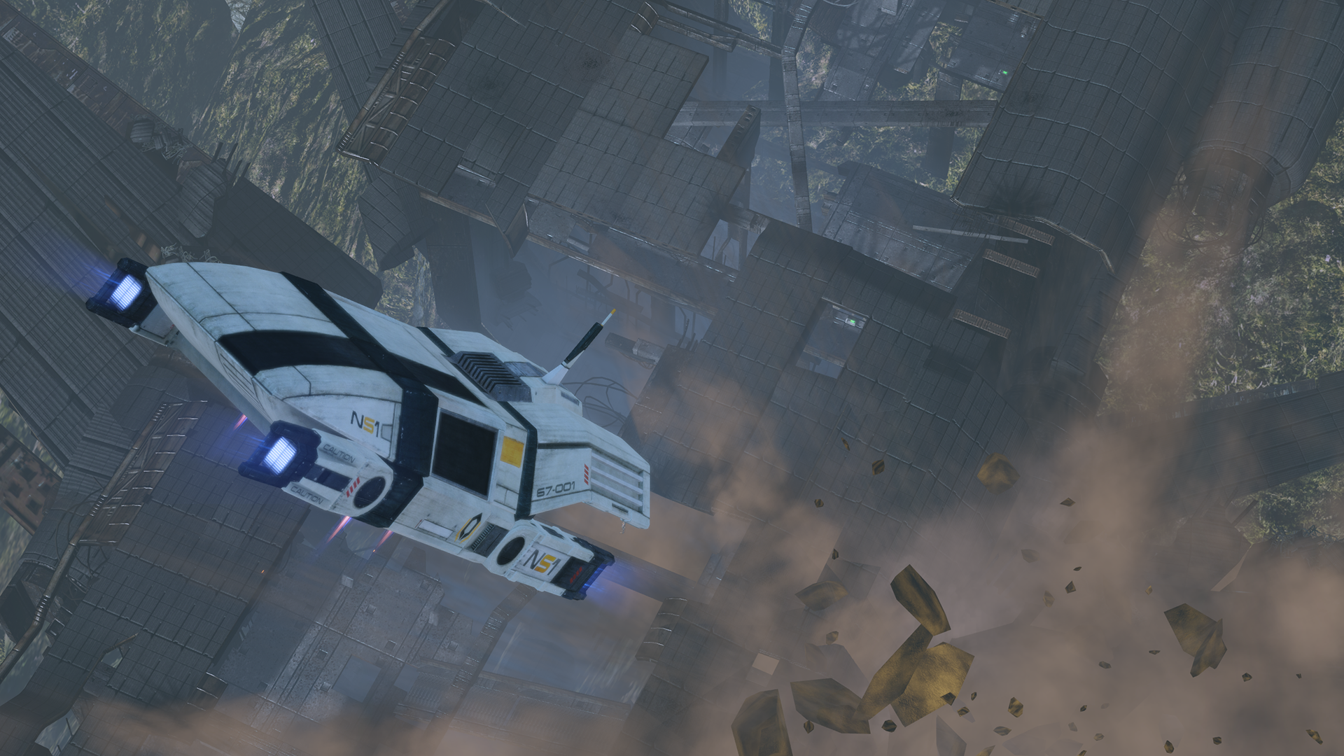 This is literally a linear walkthrough mission, as there is only one path (fairly clear, with a only a few dead end turn-offs) to reach the objective, the ship mainframe. There are a few narrow beams to be crossed, however the game will not allow Shepard to fall off. As you progress, the ship will begin to groan and pop, and start rocking precariously, and with greater frequency.