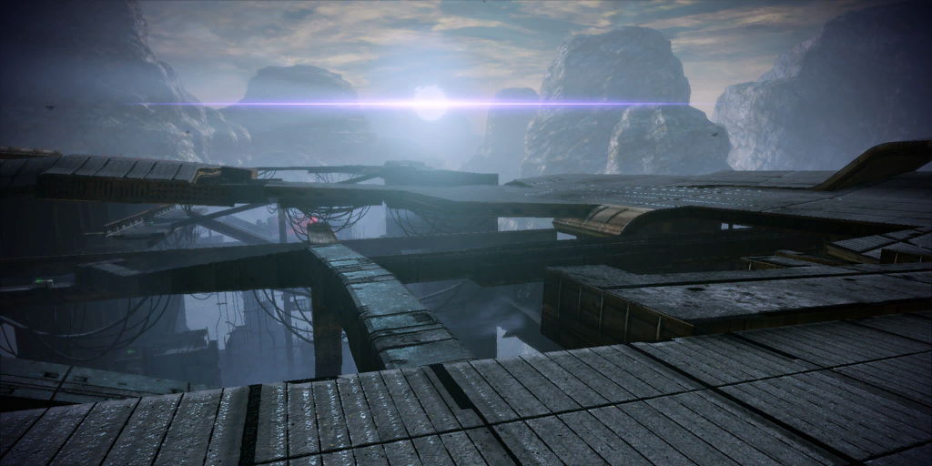 - Crossing a thin beam, especially the one that leads to the mainframe at the end of the level, seems to be almost impossible for some users, as Shepard ends up stuck in the air above it. It is not possible to return to ground level from there, nor can you return to the Normandy. Since quick saving is disabled for the whole level, you can't even save in front of the beam to try again if you get stuck, so most users with this bug have to load the autosave (which is made at the beginning of the level) and repeat until it works. Walking across the beam backwards works for some players. One possible solution to this is to keep walking on the left side of the beam until Shepard hits an invisible block, then slide to the right side and continue. If Shepard walks on the right side of the beam from the start, there is a greater chance to get stuck. Another solution is to avoid running the entire level. Holstering the weapon may solve the "floating" bug.