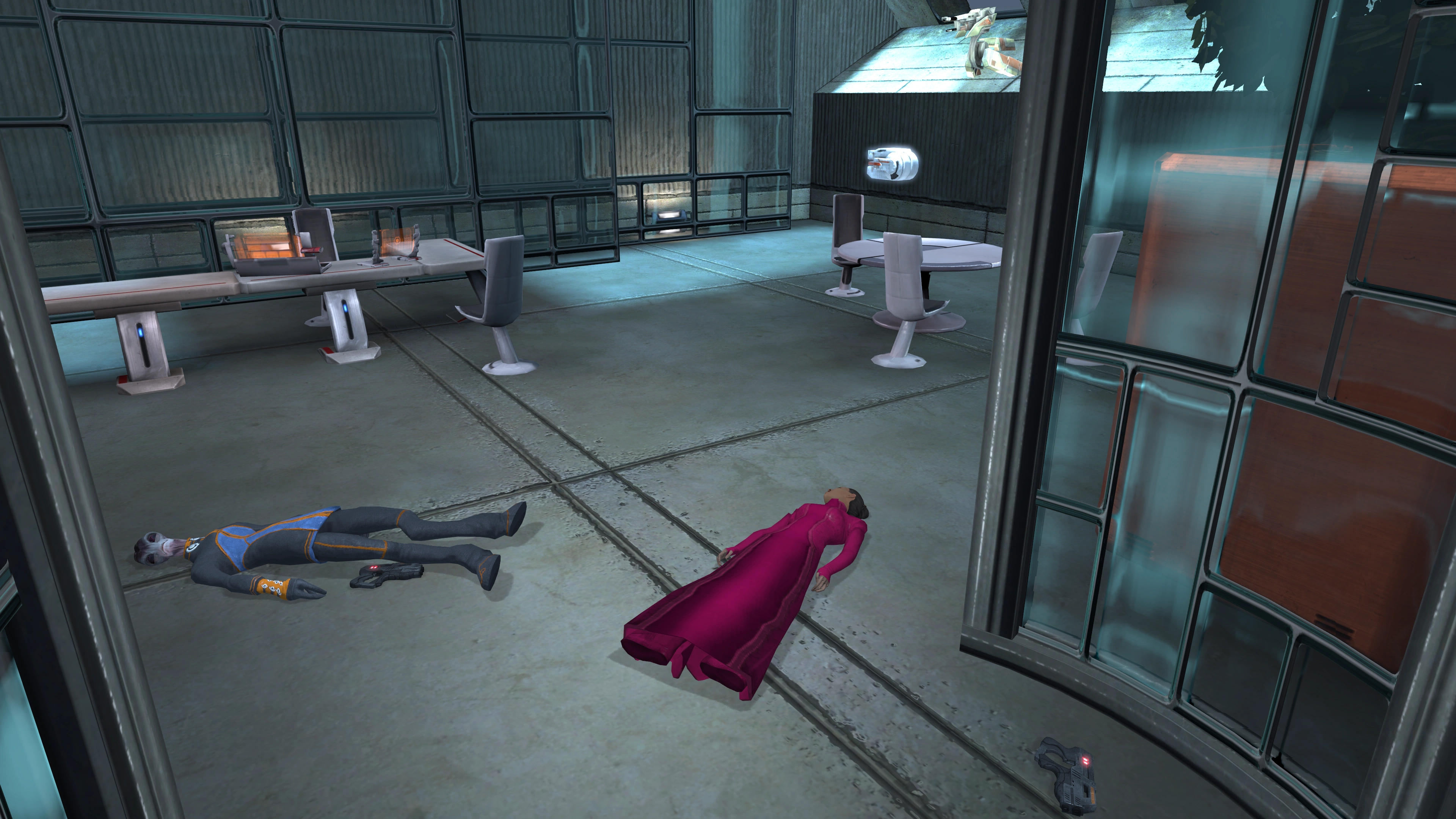 Upstairs near the stairs there are three doors to the north. All of them are inaccessible except for the leftmost one (easy Decryption) (Legendary Edition: The inaccessible doors have no lighting compared to the original version, making the leftmost door stand out more). Beyond this door is a technician kit, a medical kit, and a wall safe (easy Decryption). The actual office of Lorik Qui'in has a medical kit, a secure wall safe (average Decryption), and his personal computer which contains the evidence. When you are ready insert the OSD Lorik provided then leave.