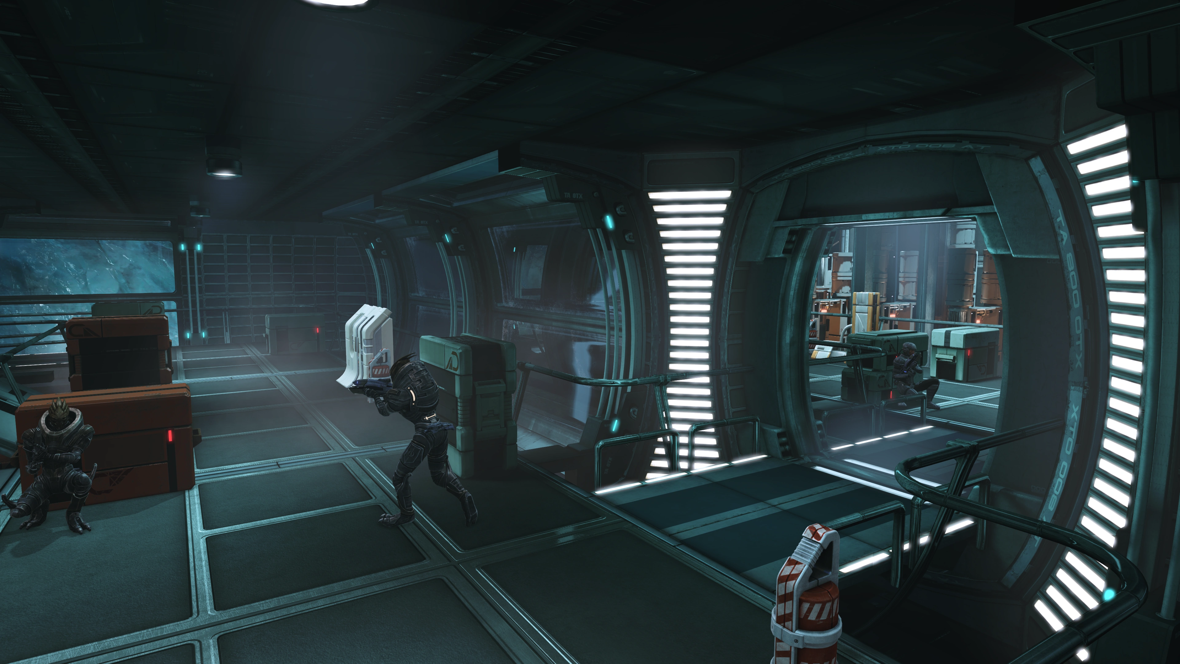 Enter the door you hacked and fight your way through another series of guards along a corridor. In this S-shaped corridor on your map you may face up to 9 ERCS Guards, all toting shotguns and assault rifles, so expect engagements at close to medium ranges. There are numerous explosive containment cells you can destroy to damage (or kill) some of the guards. The area has both indestructible and destructible cover in equal measure, so you can prevent hostiles from cowering behind the brown boxes if the need arises.