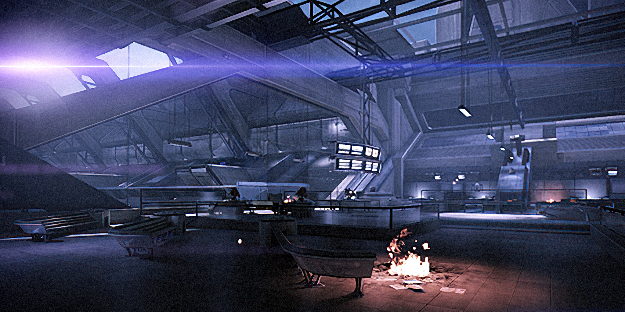 The next room is a command center and a squadmate tells you to turn on the power; to do so, use the computer in the middle of the room. You will see footage of Cerberus turning the refugees into husks. Shepard then walks to the other computer in front of the room's glass window to turn the lights on, leading to a view of the husk-infested facility beyond. The creatures quickly disperse: one gives a jump scare by creeping across the command center windows, though then again there's actually a bunch of them crawling Spider-Man style as the camera zooms out.