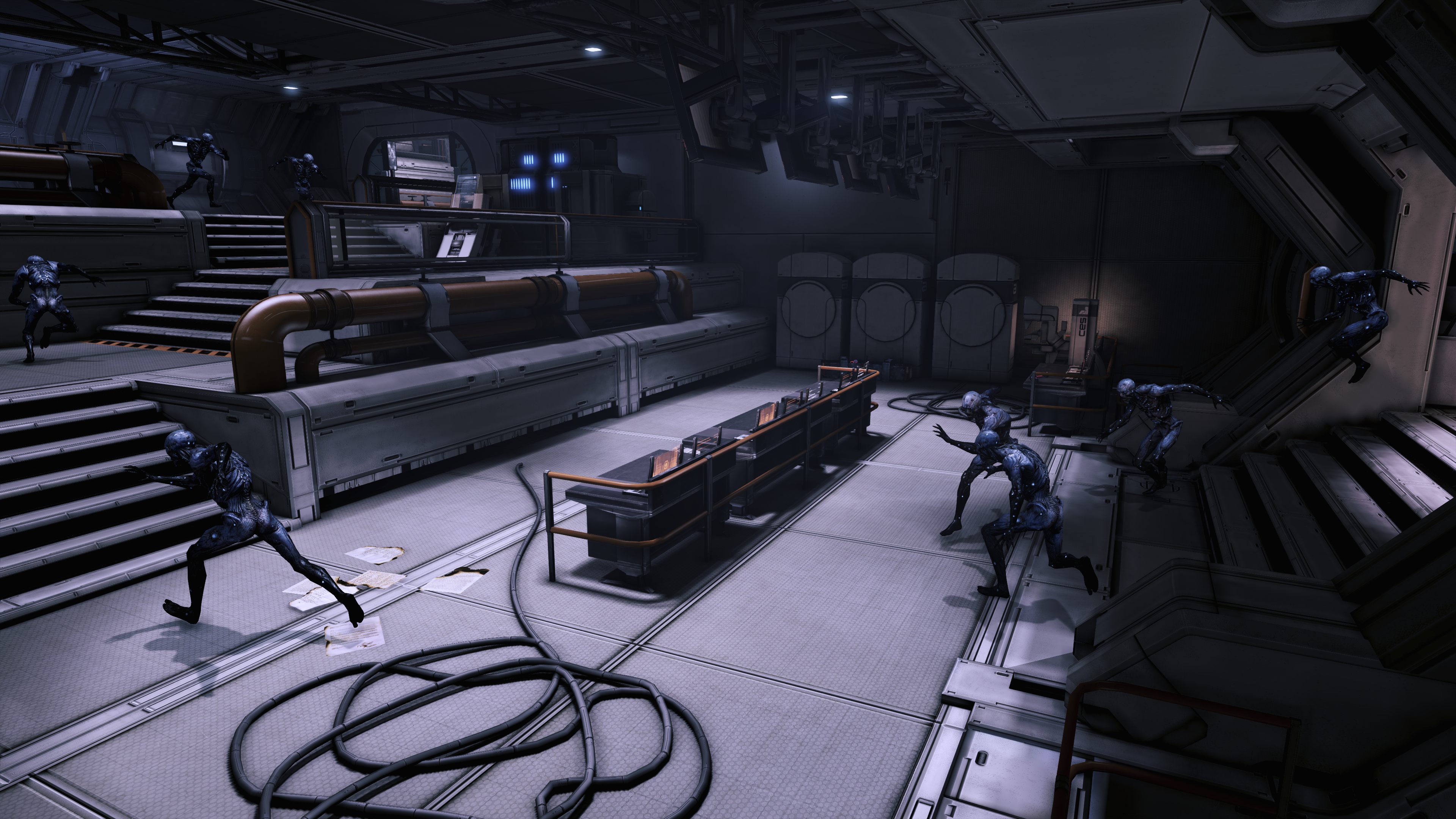 Up the ladder is another double-hallway fight. An initial 2 Ravagers, 2 Cannibals and 2 Marauders (one near the Ravagers, one by the stairs nearest to your initial location) are backed up by 2 Barrier Engines nestled between the central support struts, one near you and one further up. When some of them die another 2 Cannibals and 1 Ravager emerge from the far end of the hall, and the room the Ravager comes from has another obscure Barrier Engine that's too hidden from your initial position even with sniper rifles (the Ravager will always get a barrier buff unless you somehow close the distance fast and shoot the Barrier Engine before it does its thing, feasible with a Vanguard or Infiltrator but a real high-risk low-reward scenario).
