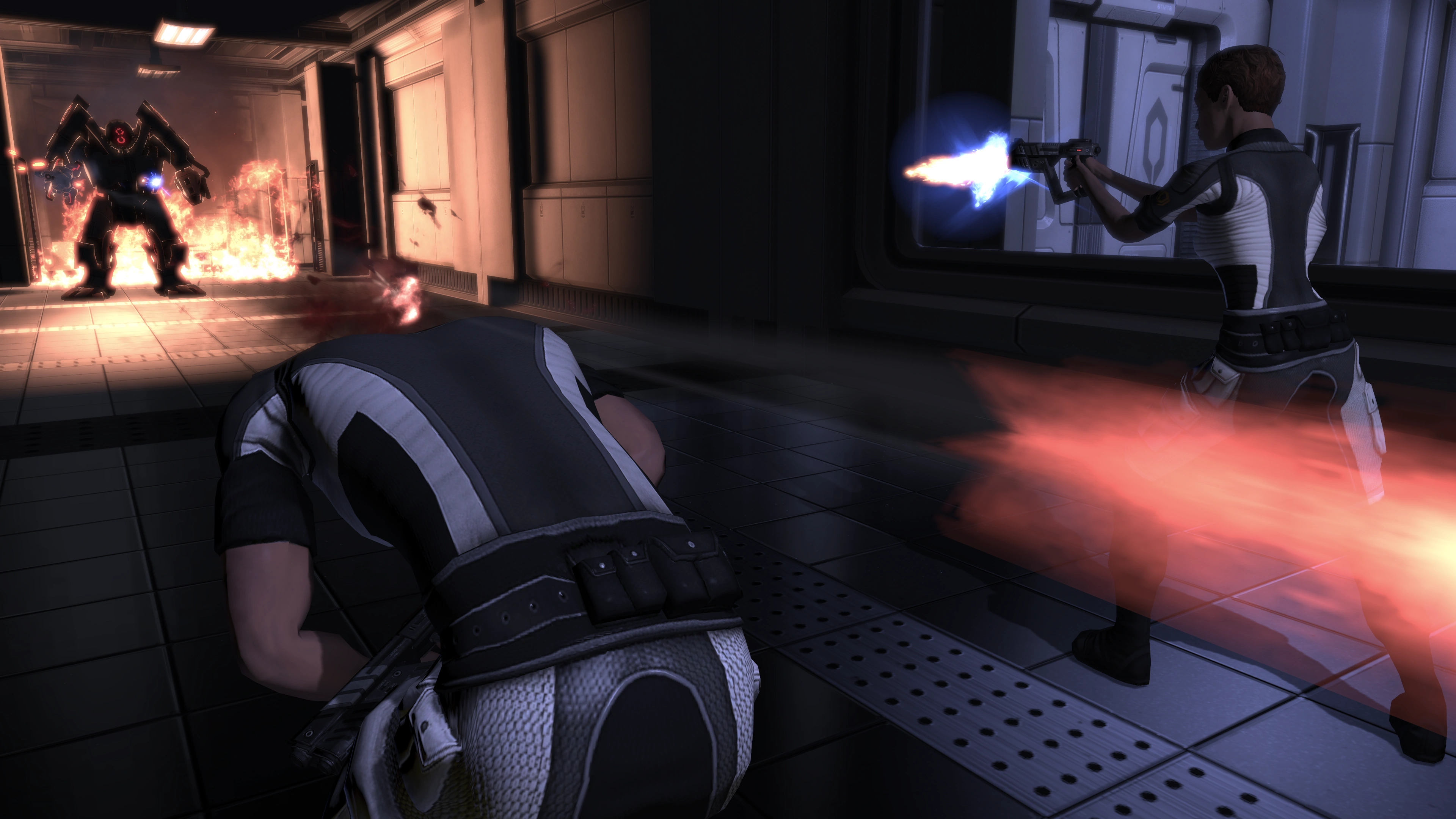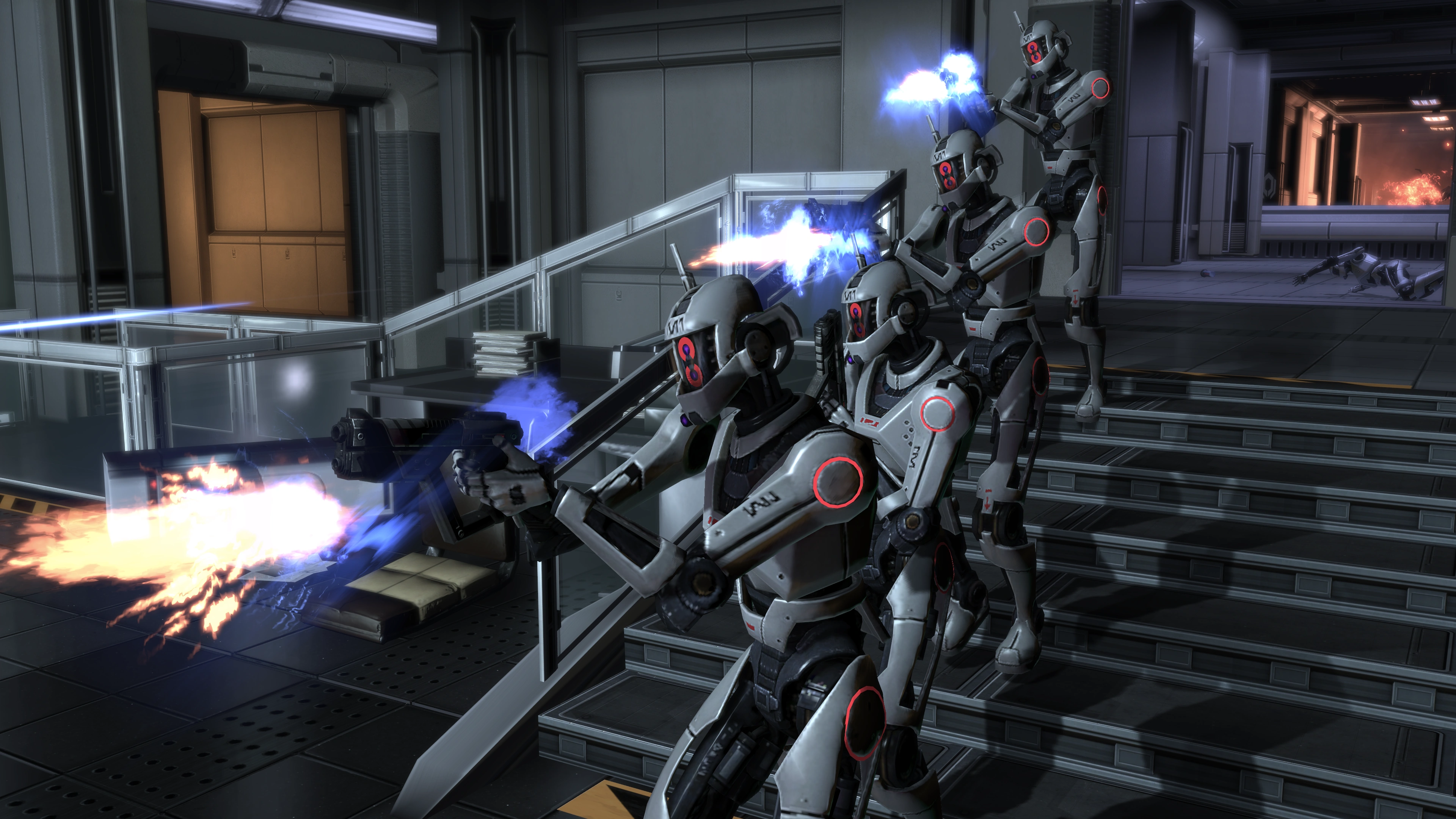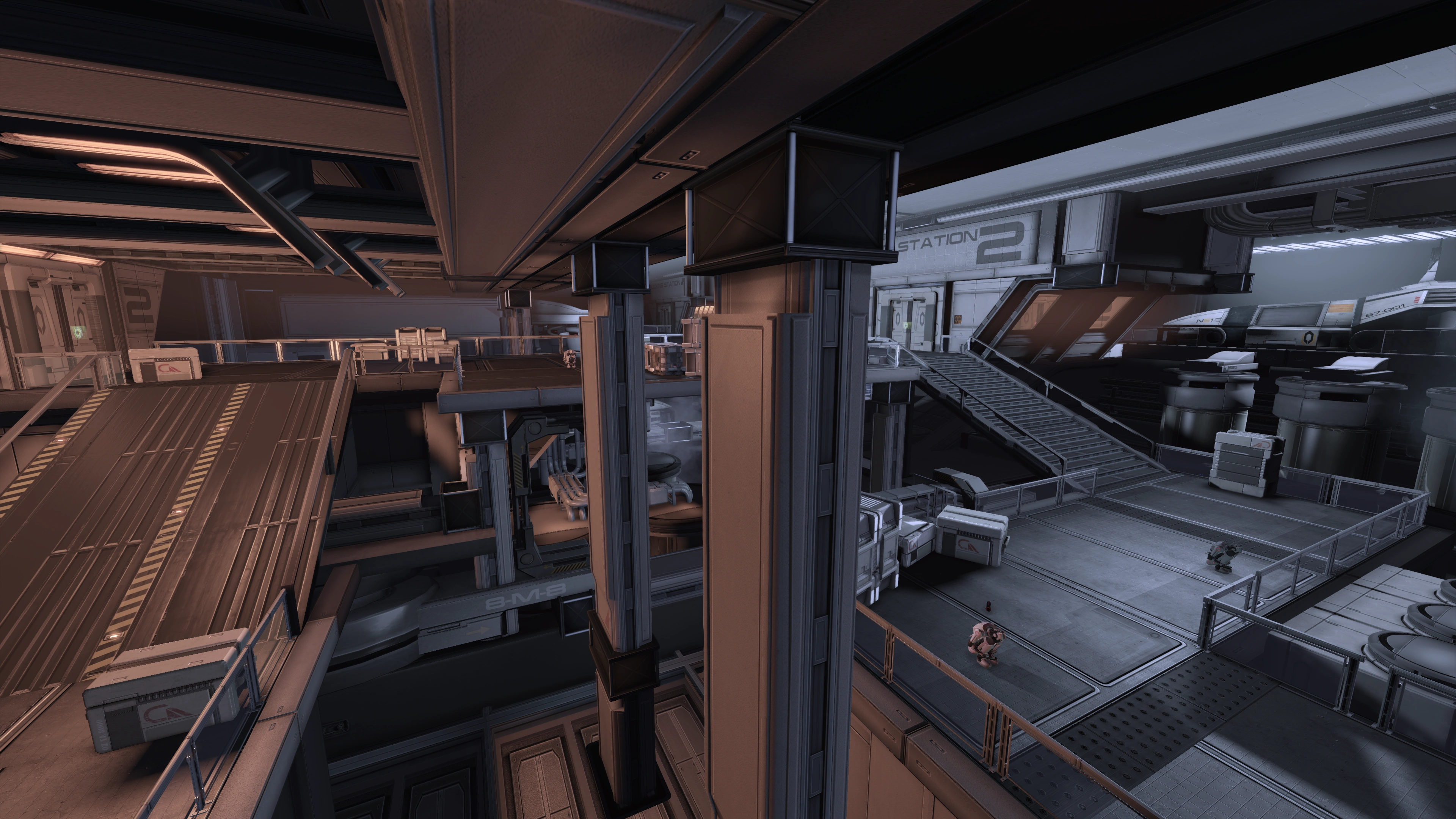 Going downstairs and through a corridor, Shepard's squad enters a large docking area, cluttered with crates and more hacked mechs. There are two staircases here, and if you initially head up the left one you will end up fighting ten more mechs, whereas if you head up the right one you will instead fight six more mechs. There are plenty of boxes and walls to take cover on, remember not to die under massed M-4 Shuriken fire.