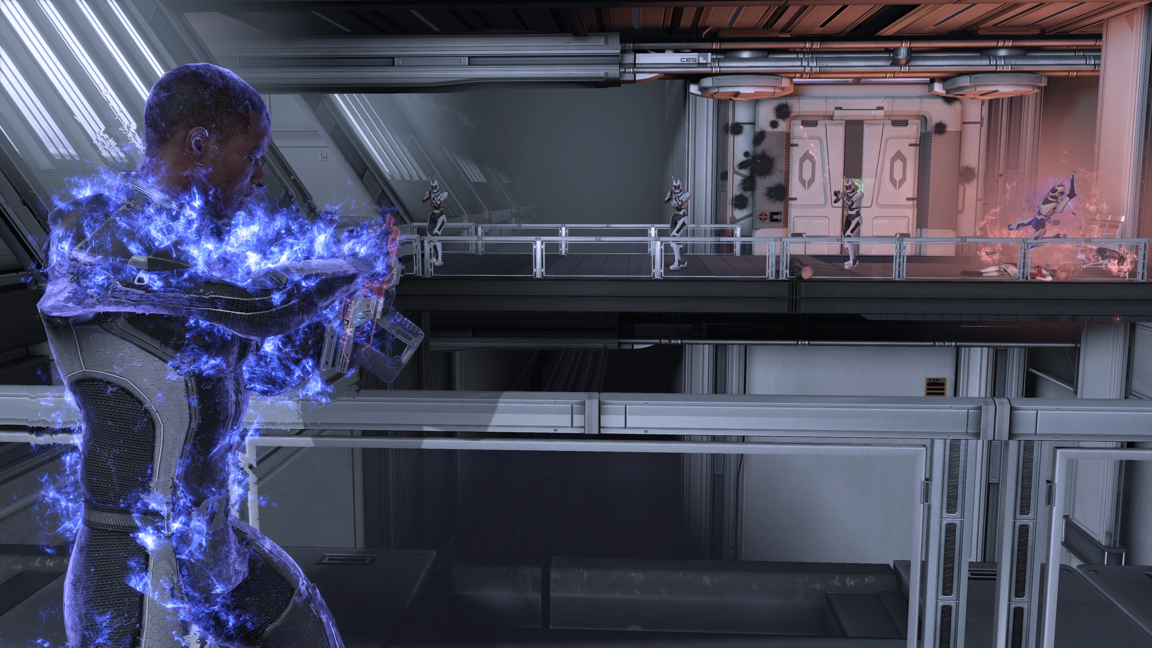 You arrive at a large well-lit observation room, where Shepard receives a radio warning that several more mechs are coming, and that the safest way to dispose of them is to take cover until they are destroyed. This room has a lot of waist-high cover to lean out of, and the mechs will arrive from the doors right in front of you and to the left. Alternatively
