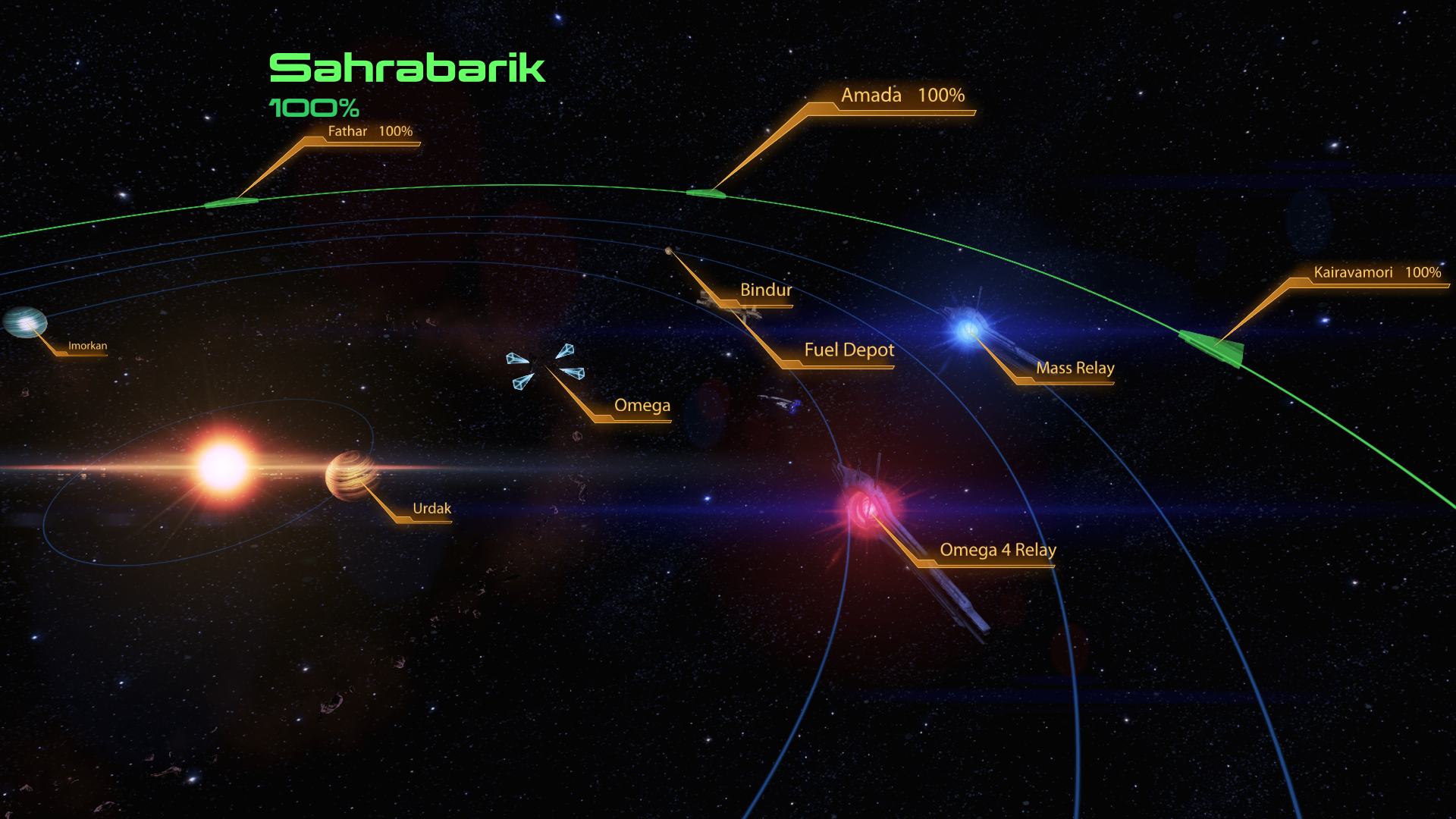 Sahrabarik has a developed infrastructure for supporting its main attraction, Omega, usually run by criminals for criminals. Imorkan is host to numerous refueling and layover stations, while the space around Urdak is often used to conduct intersyndicate warfare. The system is about 12 billion years old, and acts as a gateway system to other systems in the Omega Nebula.